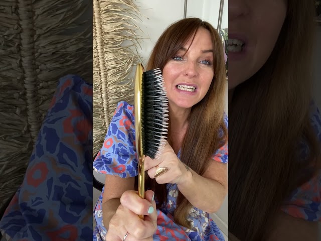 Eine Haarbürste mit doppelsystem aus Wildschweinborsten und Nylon. Die Bürste hat ein schwarzes und goldenes Finish mit einer praktischen ovalen Form.