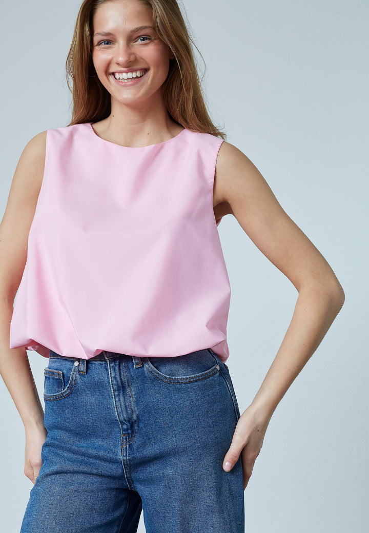 Baby rosa Top von Sisters Point mit Rundhalsausschnitt. Der Top hat eine lockere Silhouette und ein Ausschnittdesign auf der Rückseite mit dekorativen Bändern, die ihm eine feminine Note verleihen.