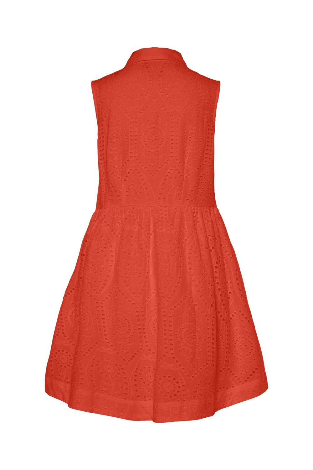Ärmelloses Hemdkleid von Y.A.S in einer roten Farbe. Das Kleid hat eine Knopfleiste vorne und eine Taillierung, die eine gute Passform bietet. Der Stoff hat ein kompliziertes Muster mit dekorativen Nähten.