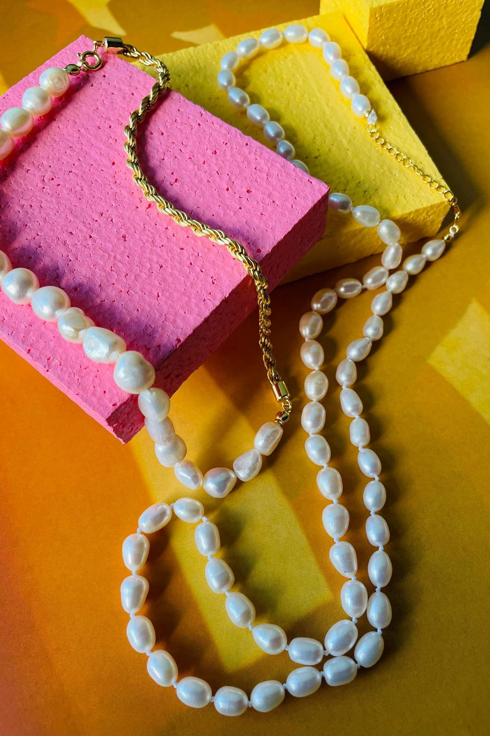 Perlenketten sind ein zeitloser Favorit. Wenn Sie mich fragen, gehören sie in jede Garderobe. Perlenketten waren schon immer modern, doch in diesem Jahr sind sie besonders beliebt. Mellow Moon bietet eine Auswahl an Perlenketten für Frauen, sowohl in klassischen Designs als auch in einer raueren Variante, bei der die Perlen unterschiedlich groß sind.