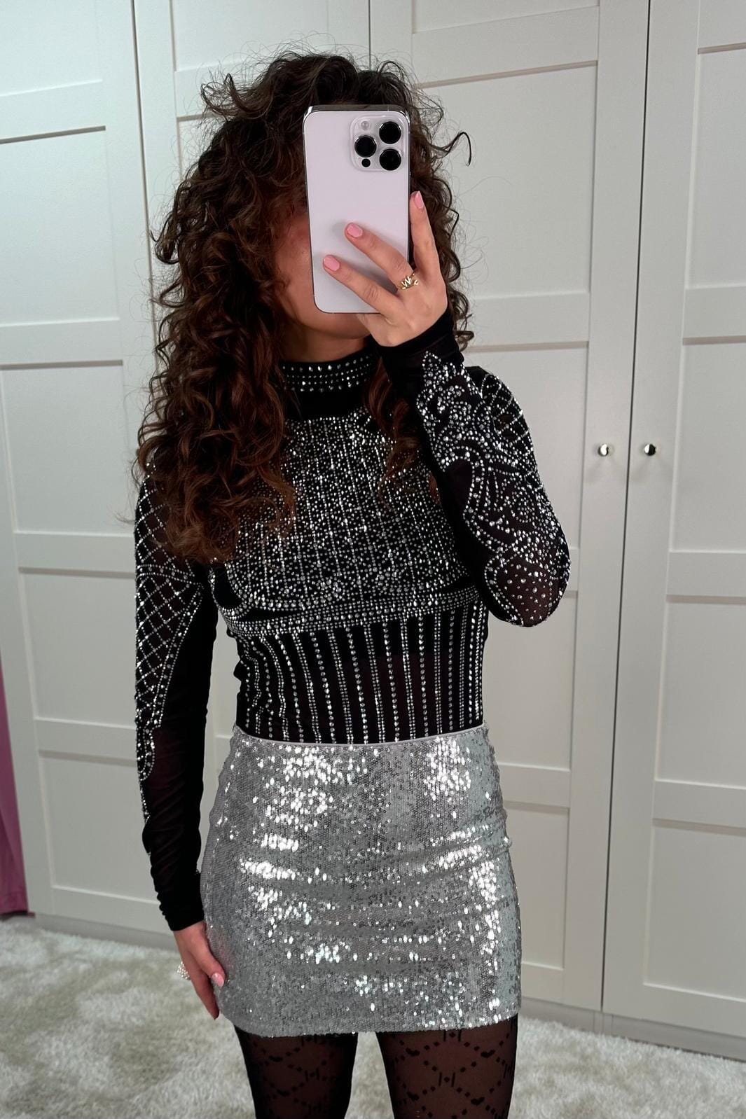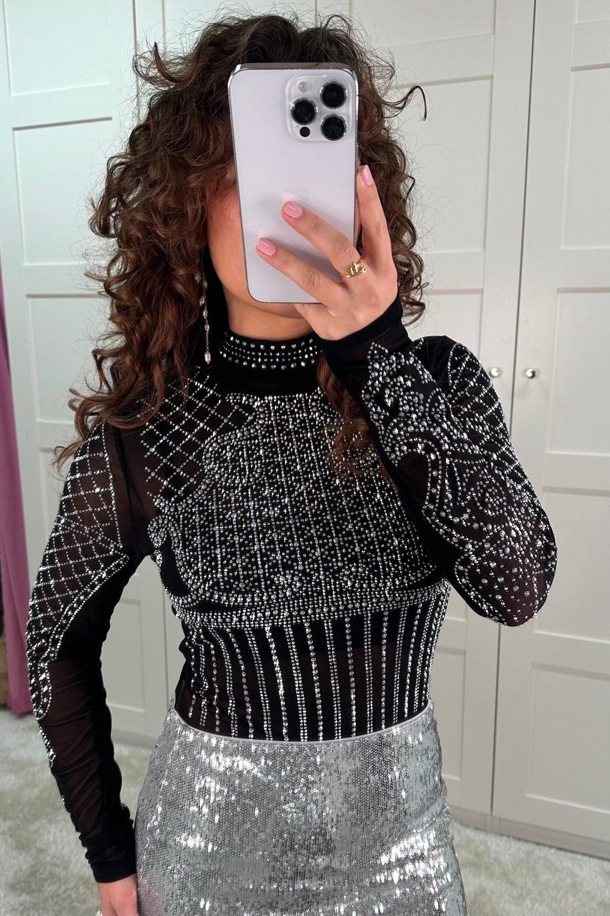 Schwarzer Bodysuit von A-bee mit Strass-Dekoration. Entworfen für festliche Anlässe, bei denen man mit einem auffälligen Look herausstechen möchte.