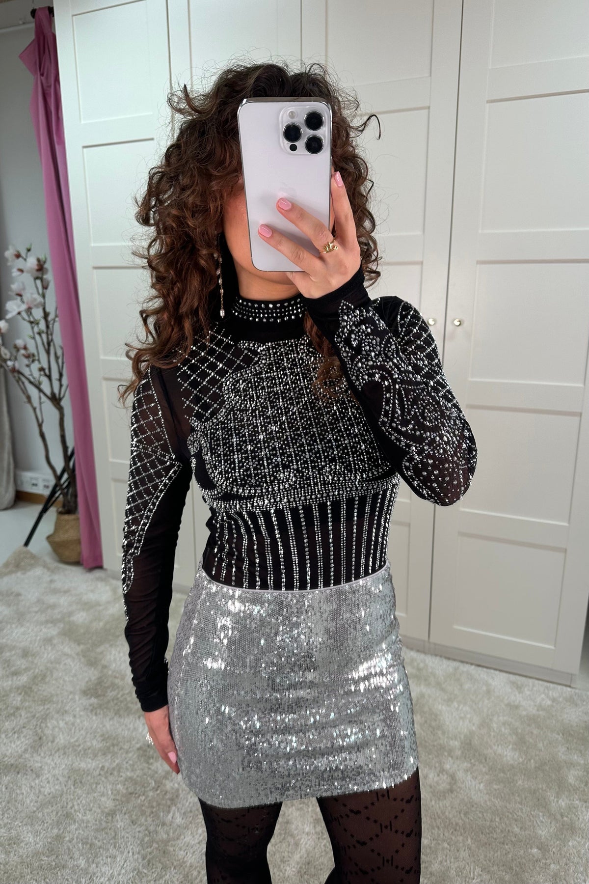 Der hohe Kragen ist mit Strasssteinen verziert, was den Ausschnitt betont. Dieses Design verleiht dem Bodysuit eine raffinierte und festliche Note.