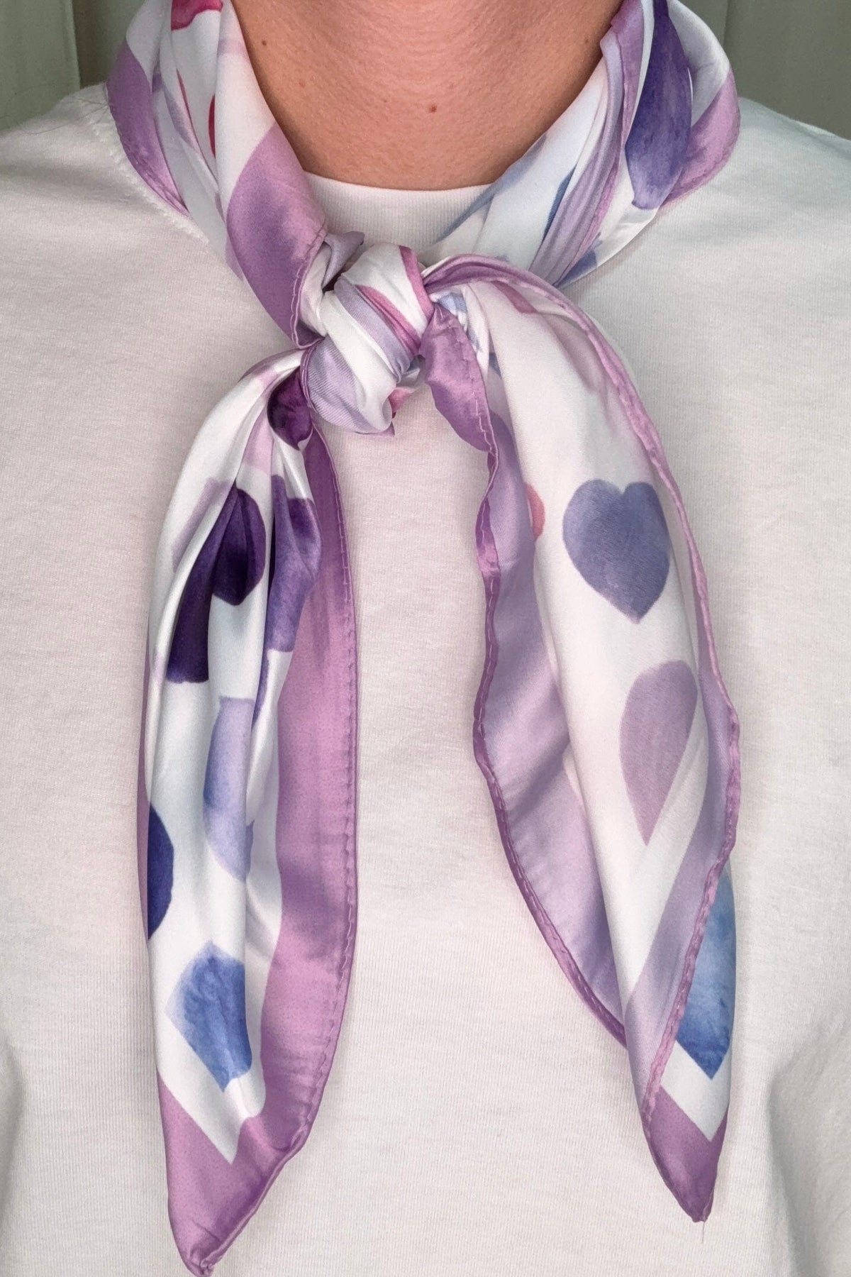 Schal von A-bee mit Herzmuster in Lila und Pink auf weißem Hintergrund. Der Schal kann sowohl um den Hals als auch als Dekoration an Taschen verwendet werden.