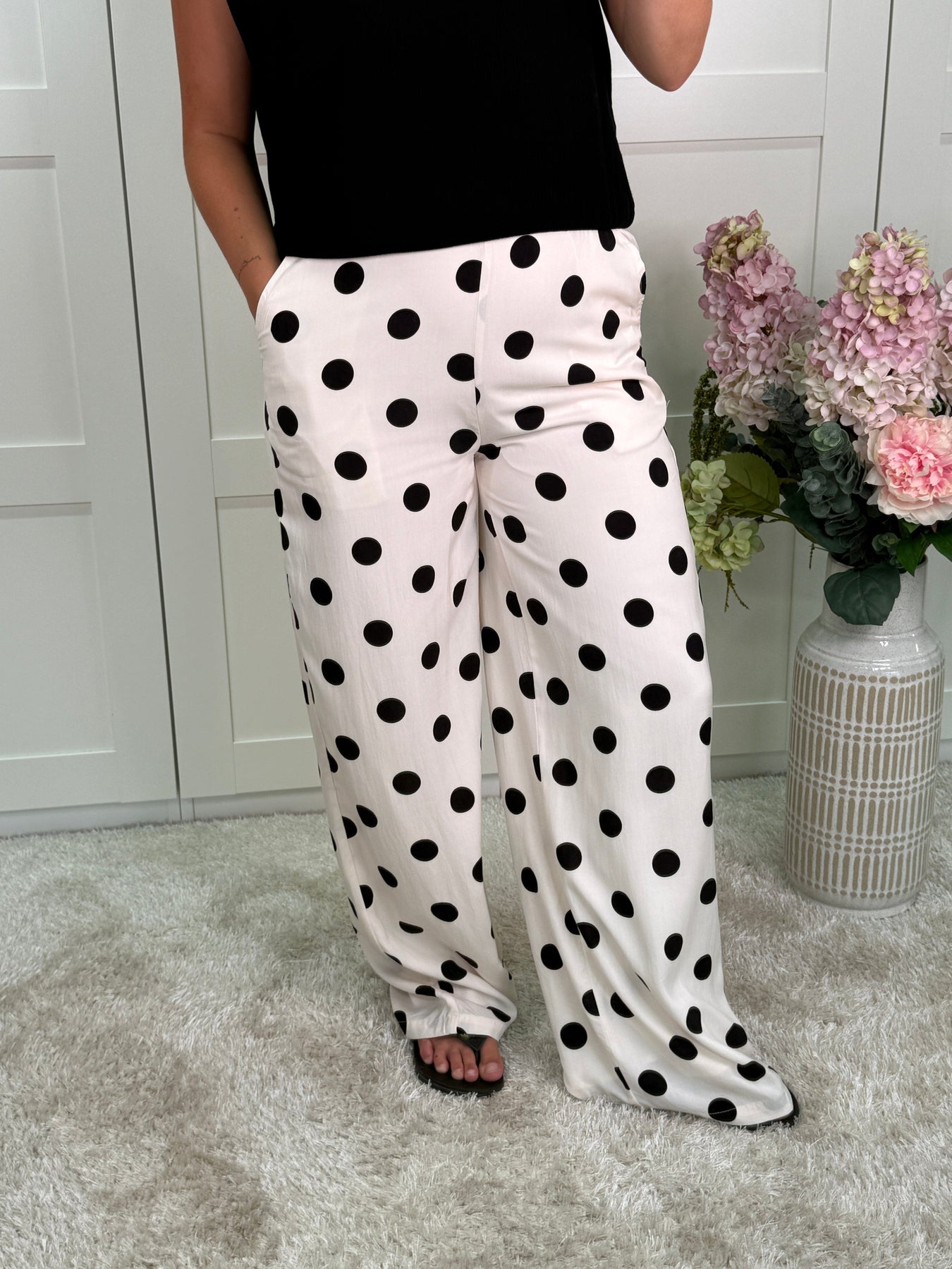 Weite Hose von A-bee in Beige mit schwarzen Polka-Dots. Die Hose hat eine lockere Passform und reicht bis zum Boden.