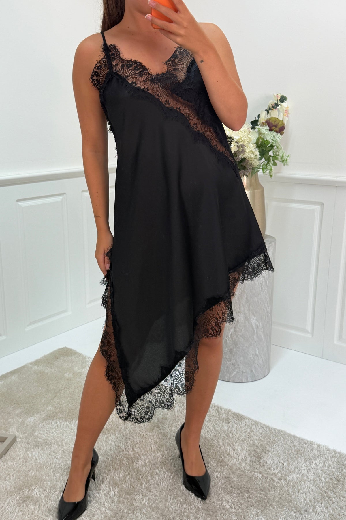 Schwarzes Partykleid von A-bee mit V-Ausschnitt und asymmetrischem Saum. Das Kleid hat Spitzendetails entlang des Ausschnitts und Saums, die dem Design einen feinen Ausdruck verleihen.