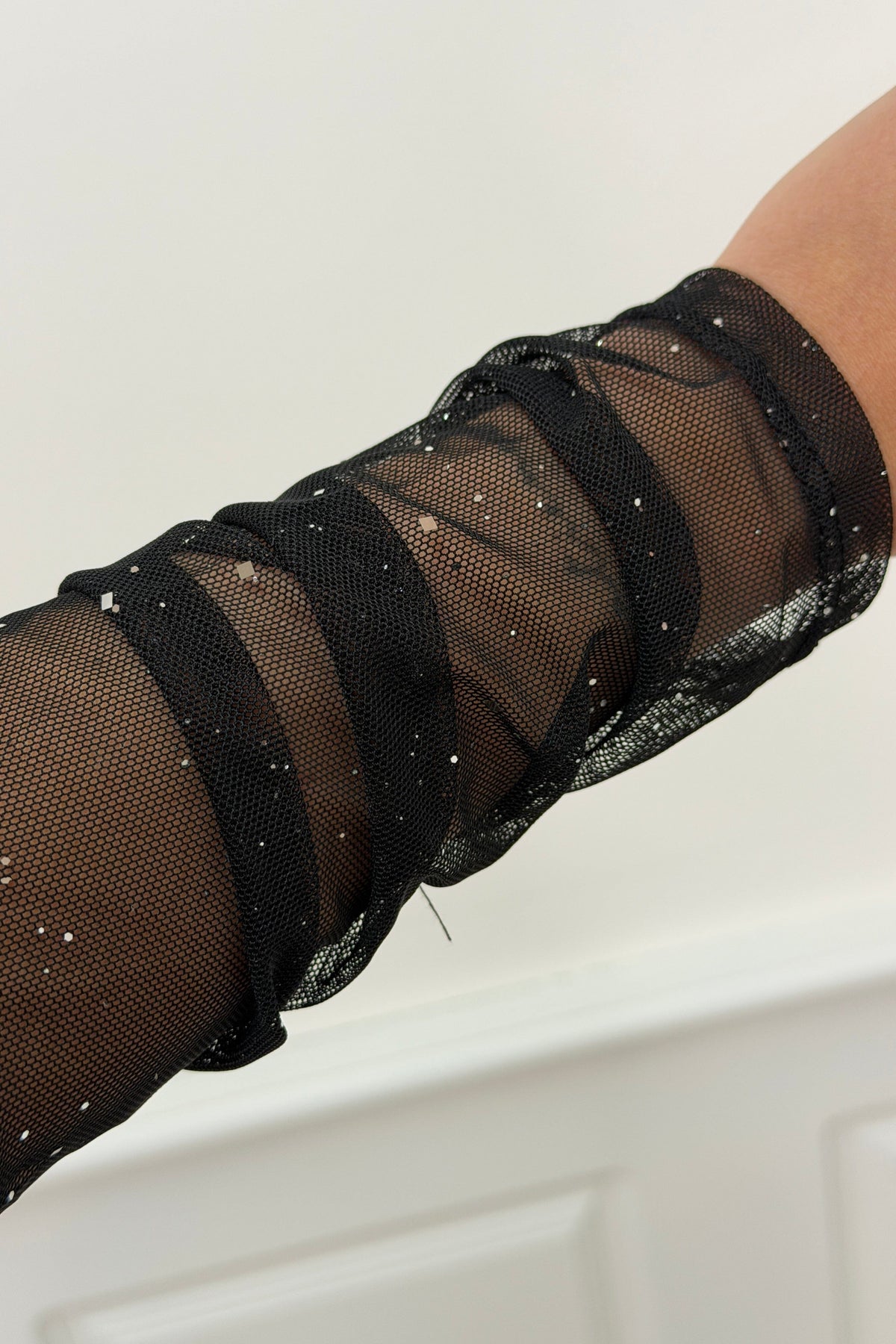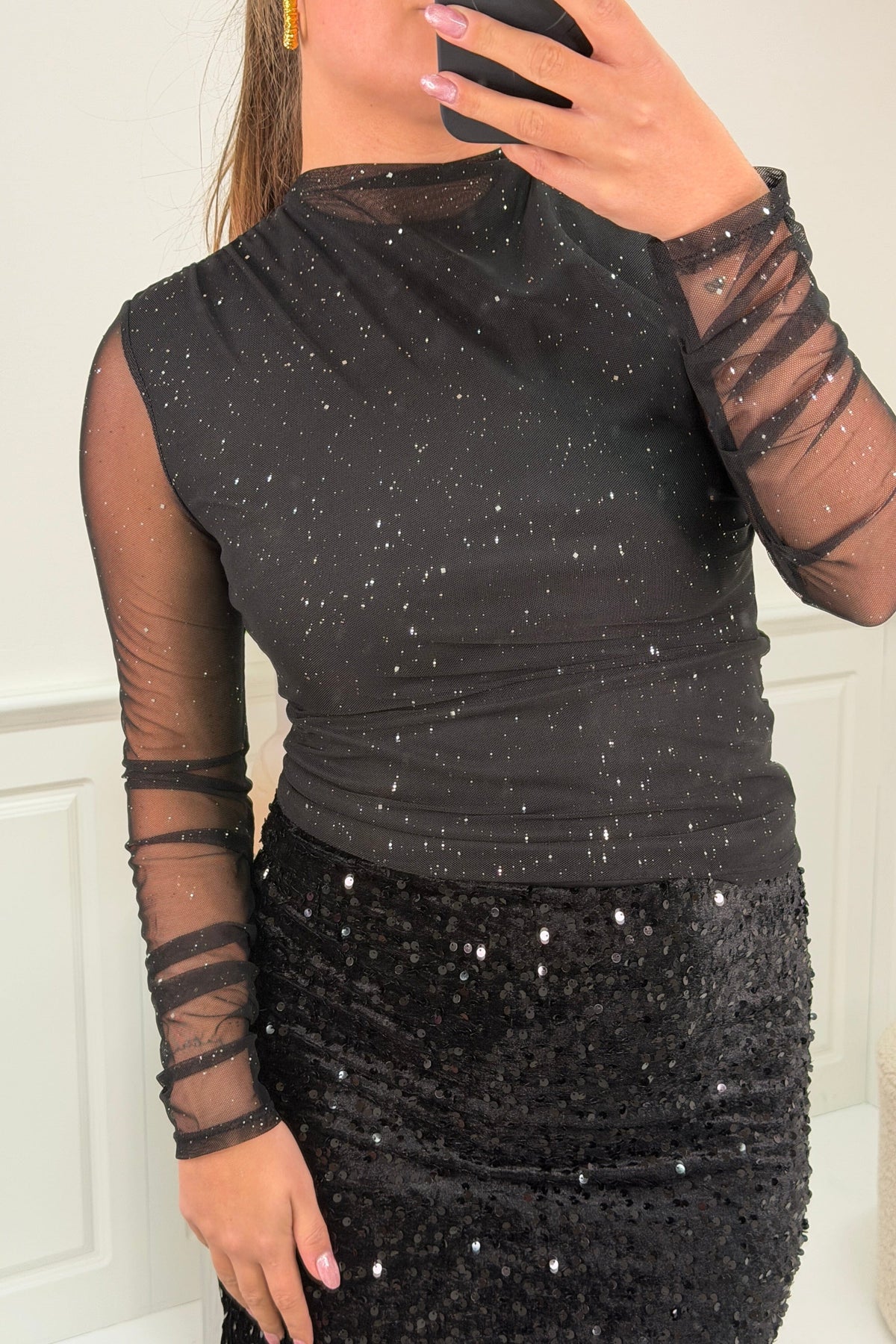 Schwarze Bluse von A-bee mit Pailletten auf dem Stoff. Die Bluse hat transparente Mesh-Ärmel und ein gerafftes Design, das sie für festliche Anlässe geeignet macht.