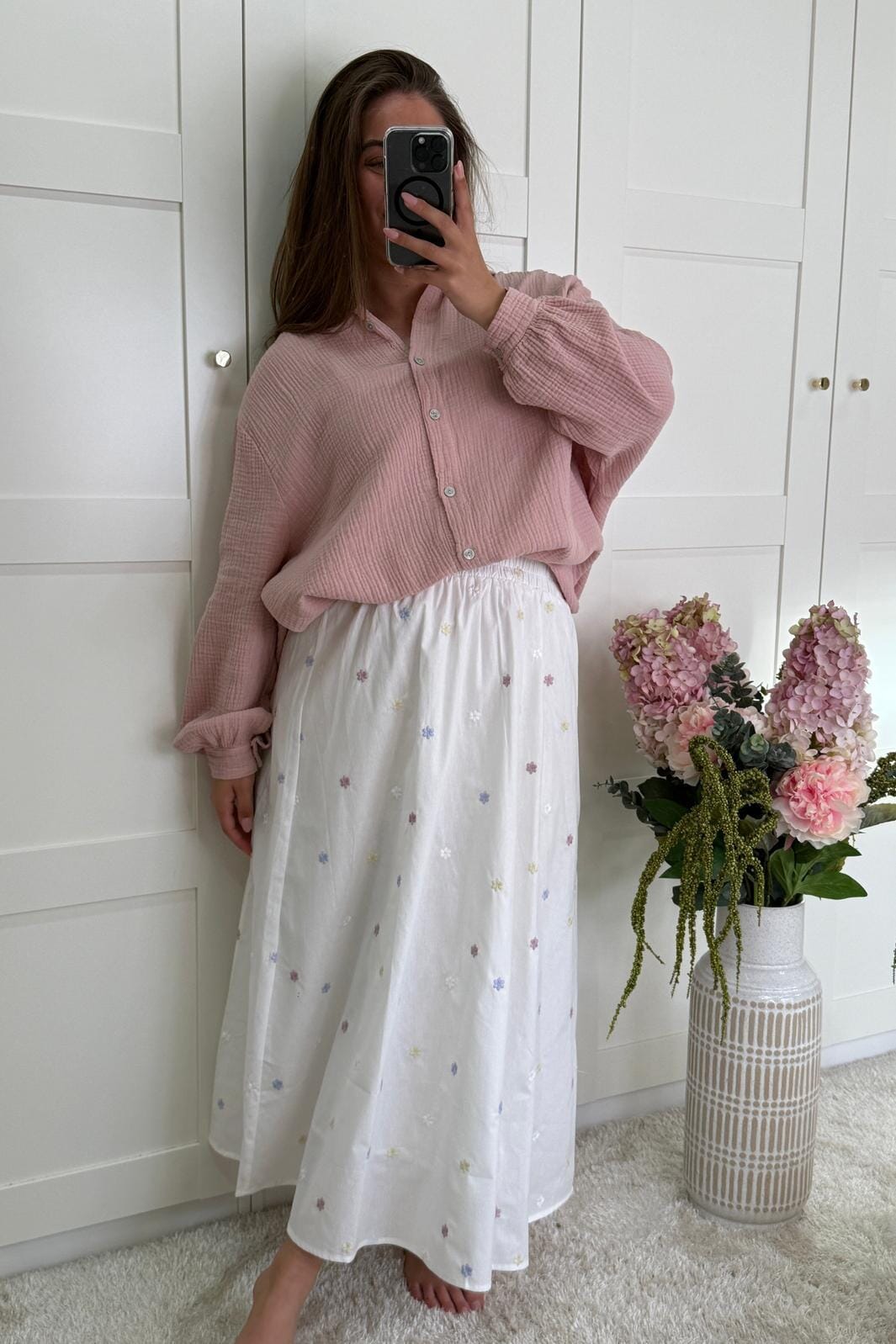 Weißer Rock von A-bee mit bestickten Blumen in Lila, Gelb und Rosa. Er hat eine lockere Passform und Knielänge, die ihn sowohl für den Alltag als auch für Feste geeignet macht.