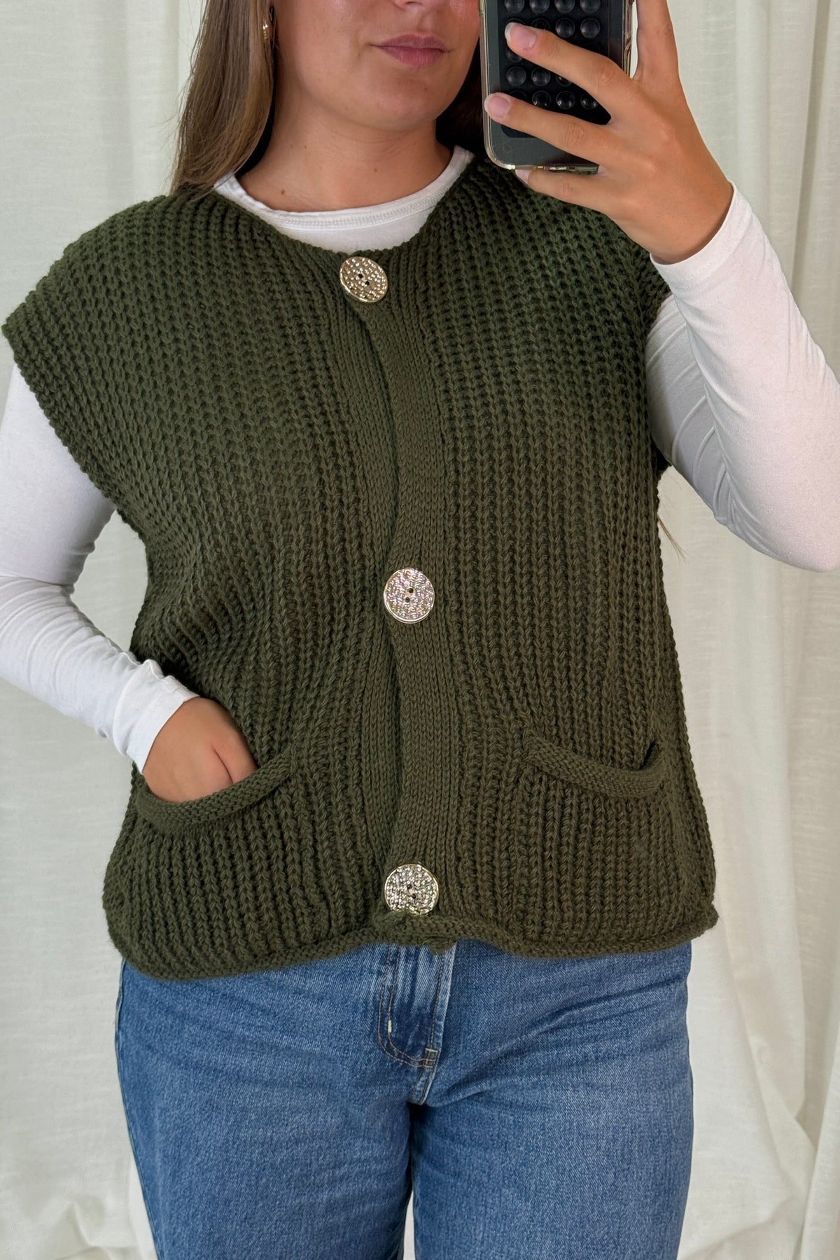 Eine grüne Strickweste von A-bee in einem Khaki-Ton. Die Weste hat vorne drei große dekorative Knöpfe und zwei praktische Taschen.
