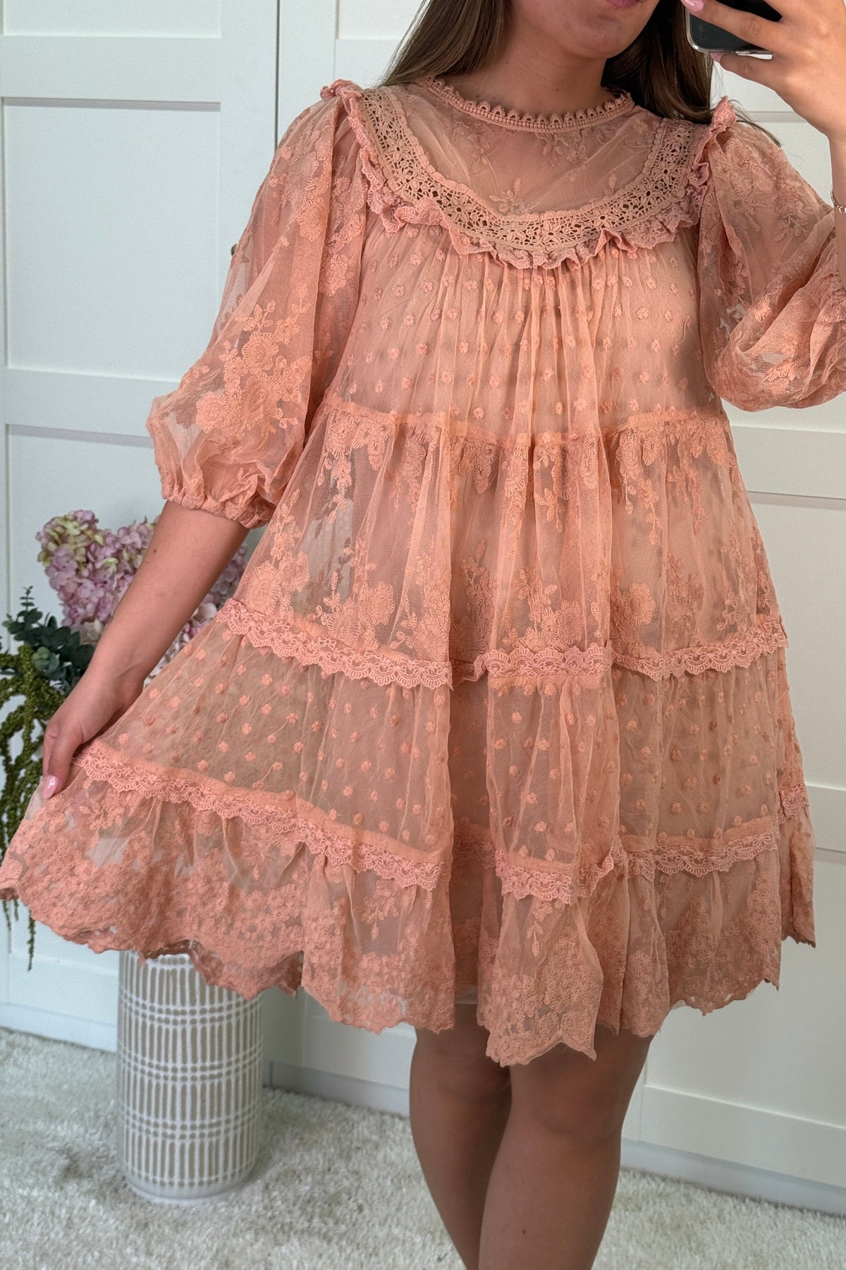 Nude Kleid von A-bee mit Spitze und Volants. Es hat einen Peter-Pan-Kragen und puffige 3/4-Ärmel. Das Design des Kleides kombiniert ein blumenmuster aus Spitze mit mehreren Lagen von Volants.