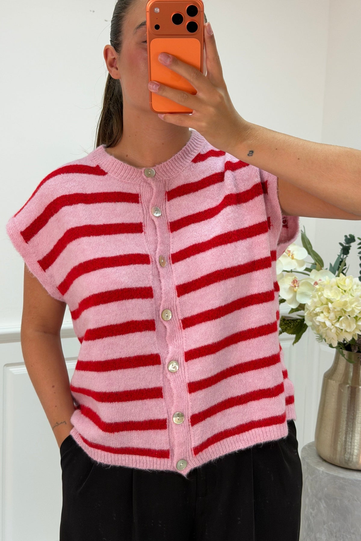 Gestreifte Weste von A-bee mit roten und rosafarbenen horizontalen Streifen. Die Weste hat Perlendetails und einen Knopfverschluss vorne.