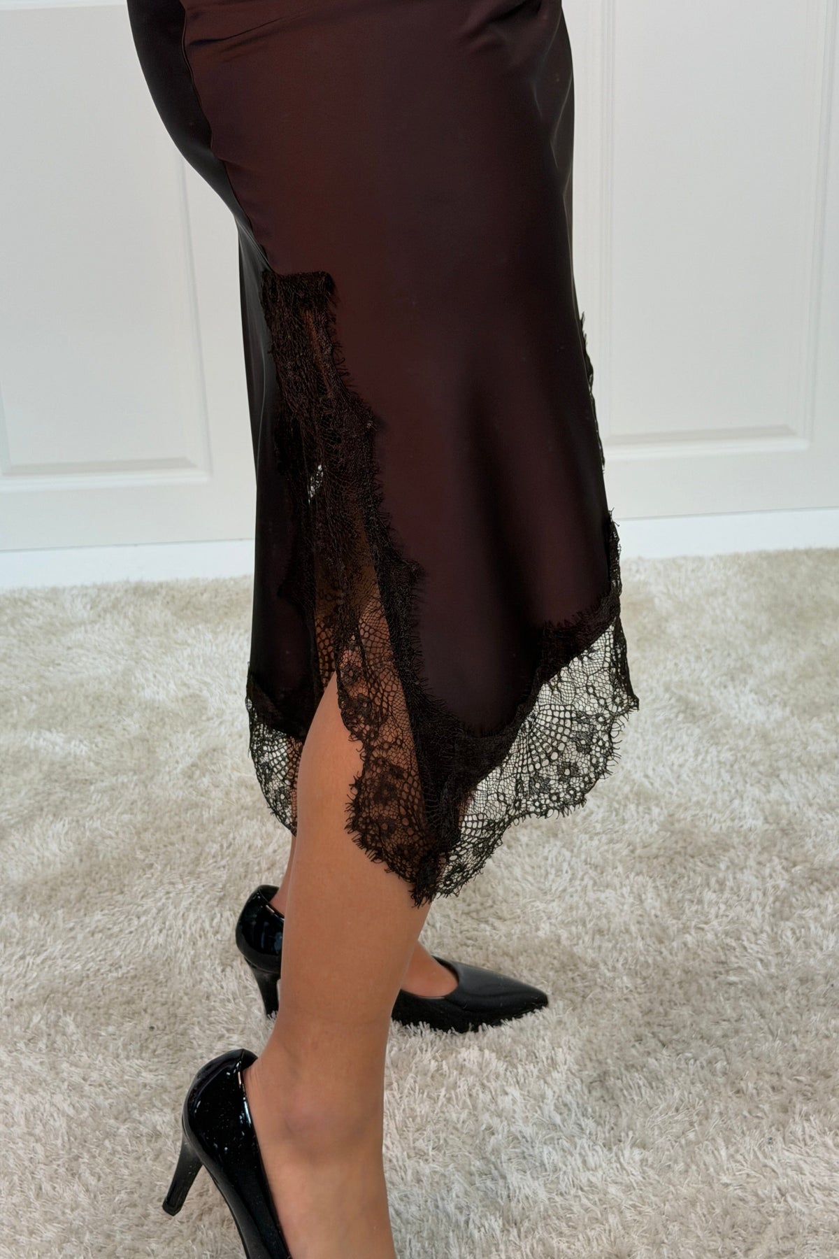 Brauner Rock von A-bee mit Spitzendetails entlang des Saums. Der Rock ist aus Viskose gefertigt und hat eine Länge bis zur Wade mit normaler Taillenhöhe.
