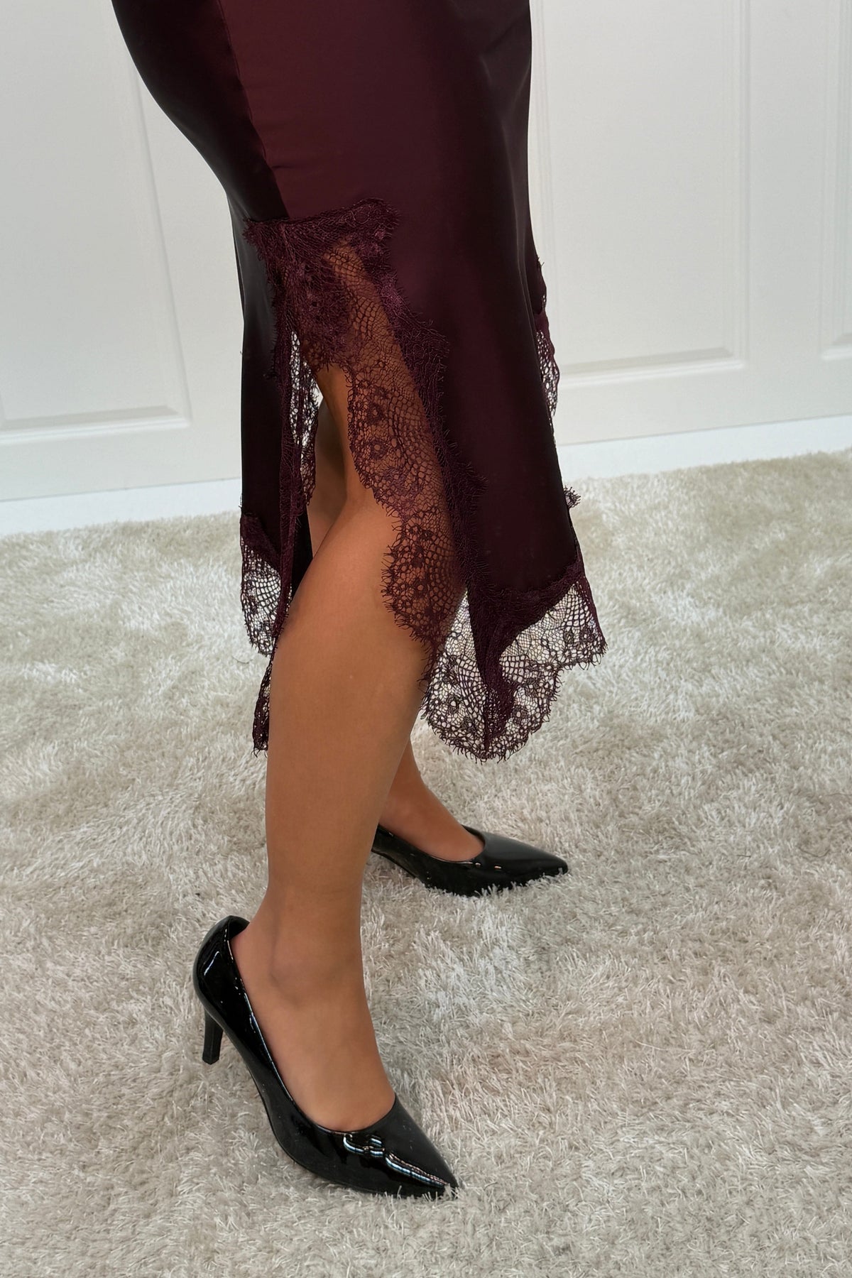 Pflaumenfarbener Rock von A-bee mit Spitzendetails entlang des Saums. Der Rock hat eine Länge bis zur Mitte der Wade und eine glatte Oberfläche mit glänzendem Finish.