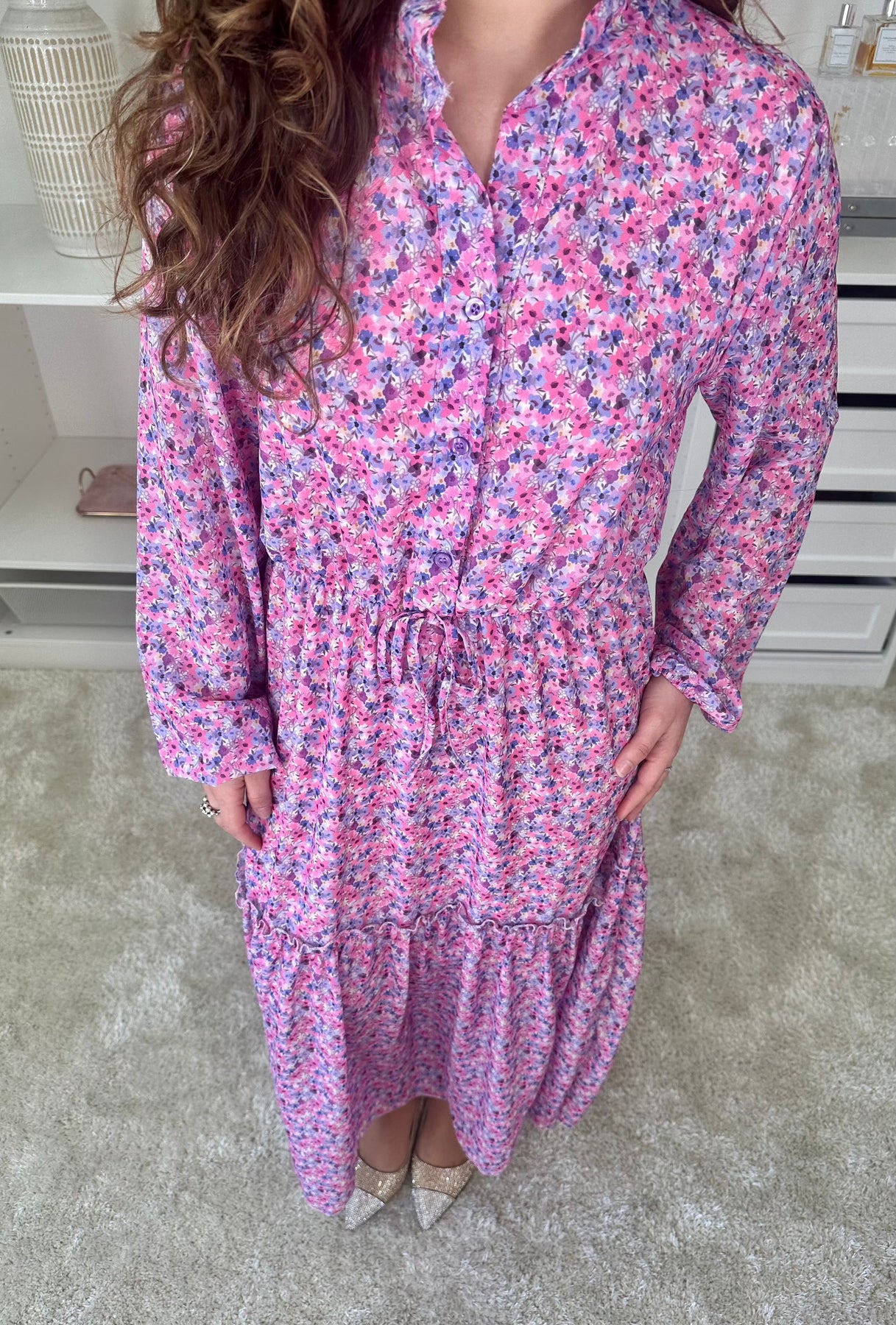 Langes Kleid von A-bee mit Blumenmuster in Pink- und Lilatönen. Das Kleid hat einen Hemdkragen, eine Knopfleiste vorne und lange Ärmel.