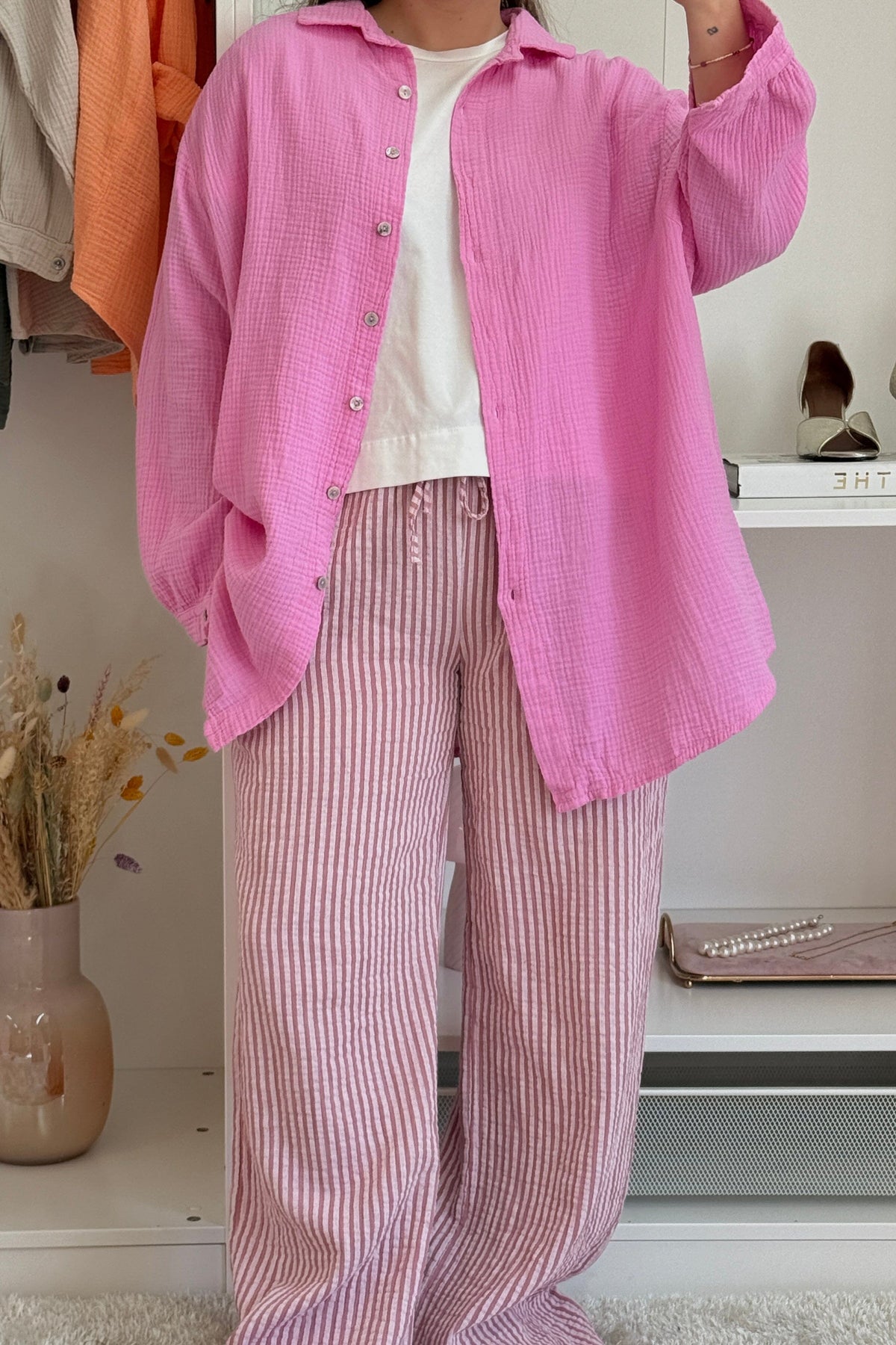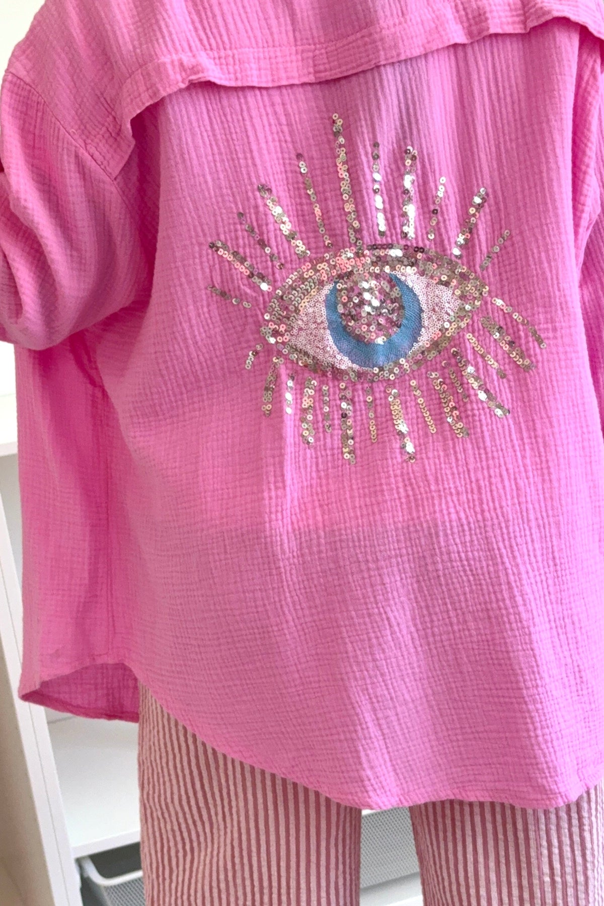 Rosa Hemd von A-bee mit einem auffälligen Design. Das Hemd hat Metallknöpfe und ein großes, mit Pailletten besetztes Augenmotiv auf dem Rücken, das es zu einem besonderen Kleidungsstück macht.
