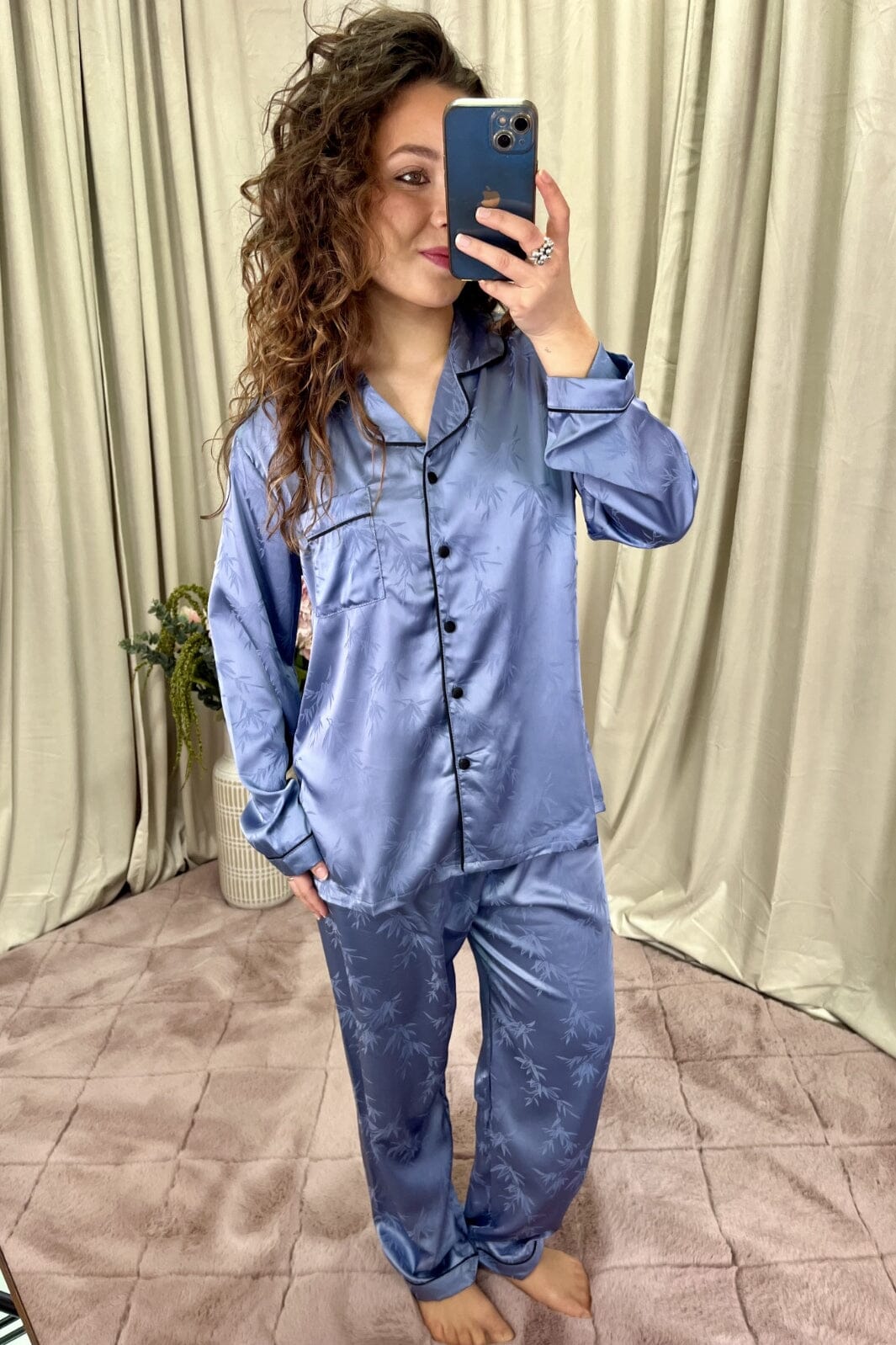 Blaue Pyjamas von A-bee mit Bambusblatt-Muster und schwarzem Kantenband. Das Set besteht aus einem Hemd mit Brusttasche und passenden Hosen aus einem glänzenden Stoff.