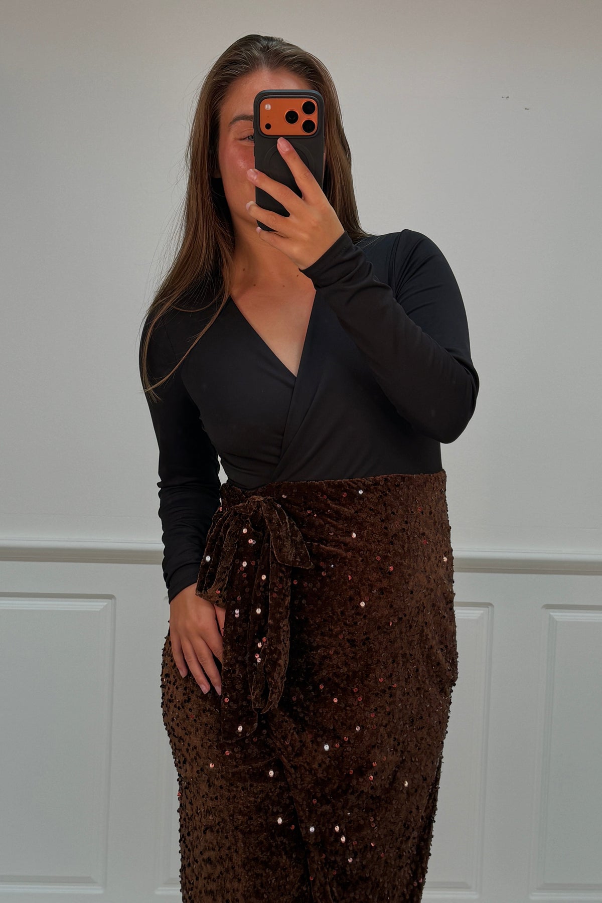 Kleid von A-bee mit schwarzem Oberteil und dunkelbraunem, paillettenbesetztem Rock. Es hat einen Wickelstil oben mit V-Ausschnitt und langen Ärmeln. Der Rock reicht bis zu den Waden.