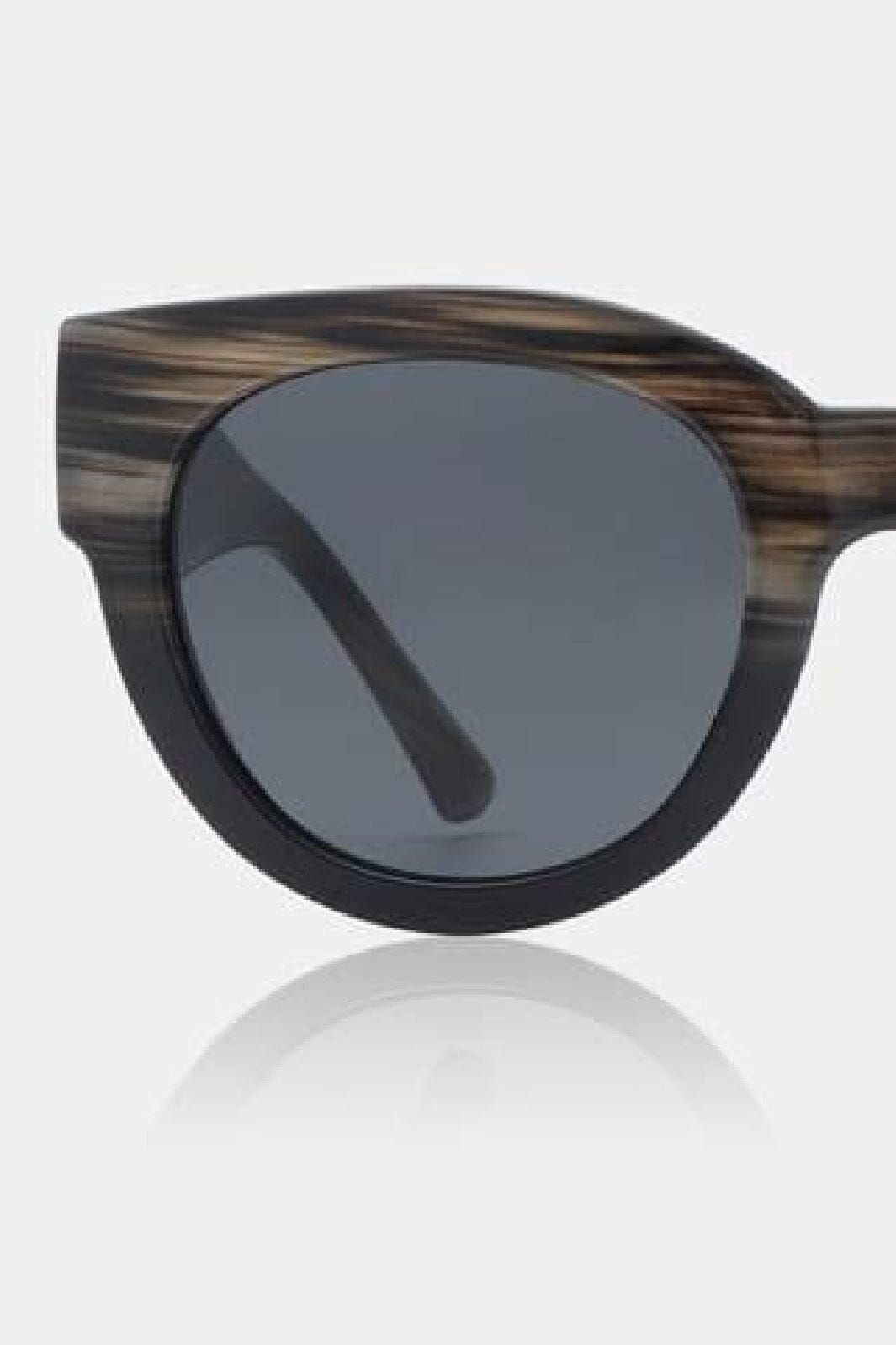 Sonnenbrillen von A. Kjærbede mit Cat-Eye-Form aus gestreiftem Horn und Schwarz. Das Gestell besteht aus Tritan Renew und Polycarbonat mit breiten Rahmen und runder Form.
