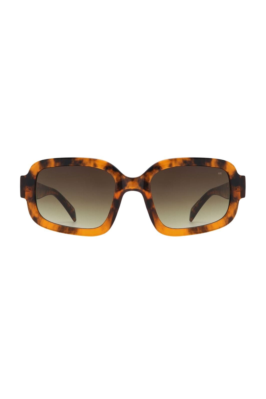 Sonnenbrille von A. Kjærbede mit eckigem Gestell in brauner Havana-Farbe. Das Gestell hat ein Schildpattmuster und getönte Verlaufsgläser mit einem kräftigen Rahmen.
