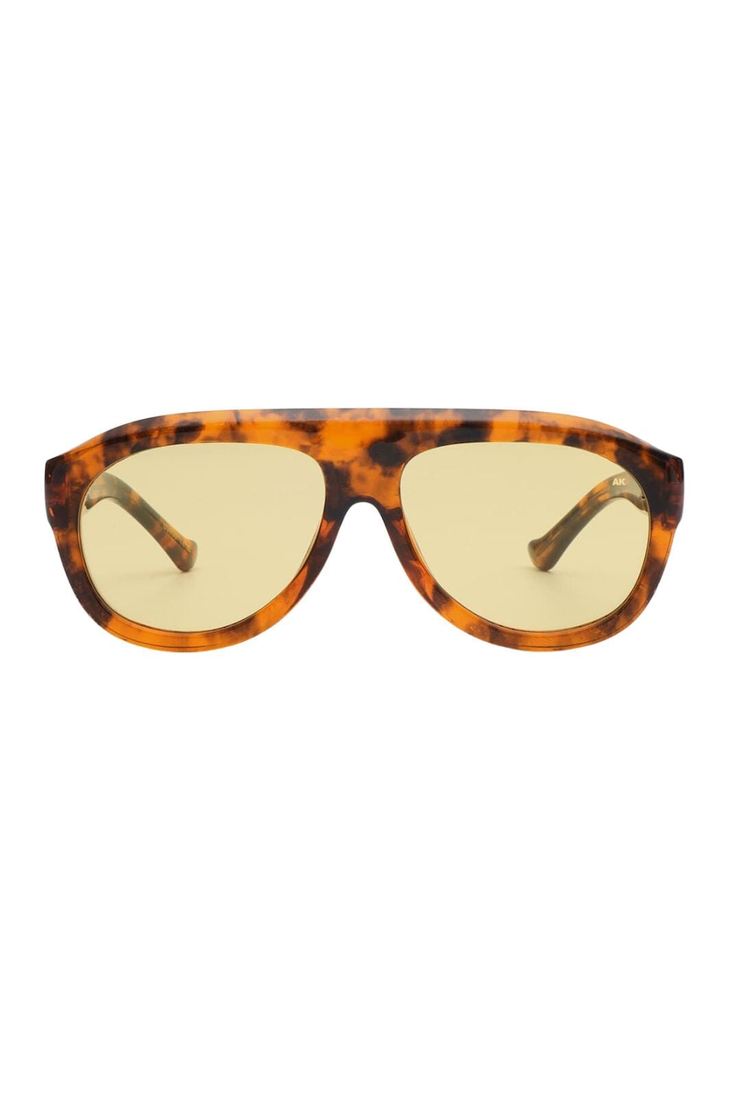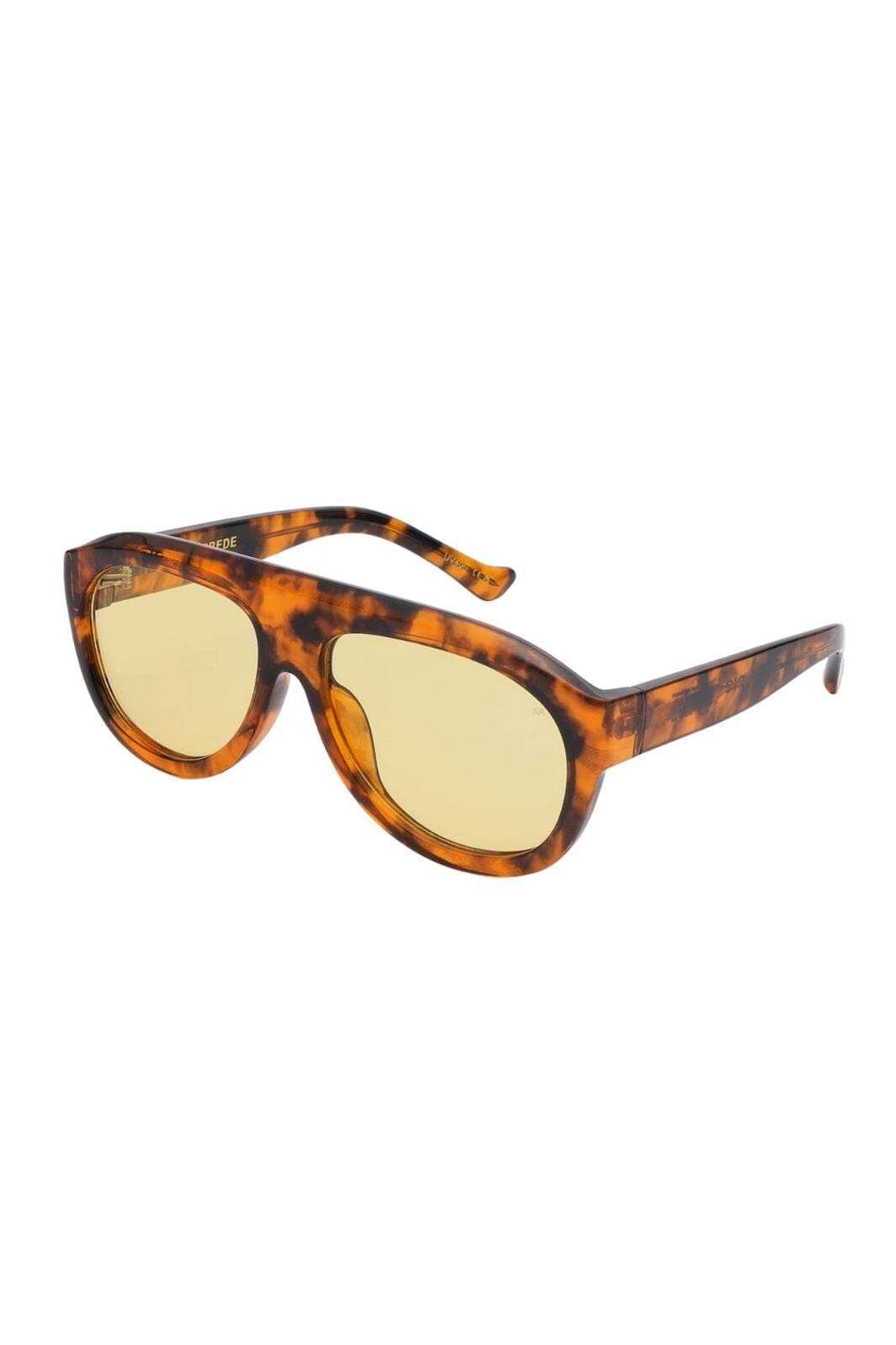 Sonnenbrillen von A. Kjærbede mit einer orange, braun und gelb Farbkombination. Das Gestell hat eine breite Oberkante und ein charakteristisches Tortoiseshell-Muster mit gelben Gläsern.