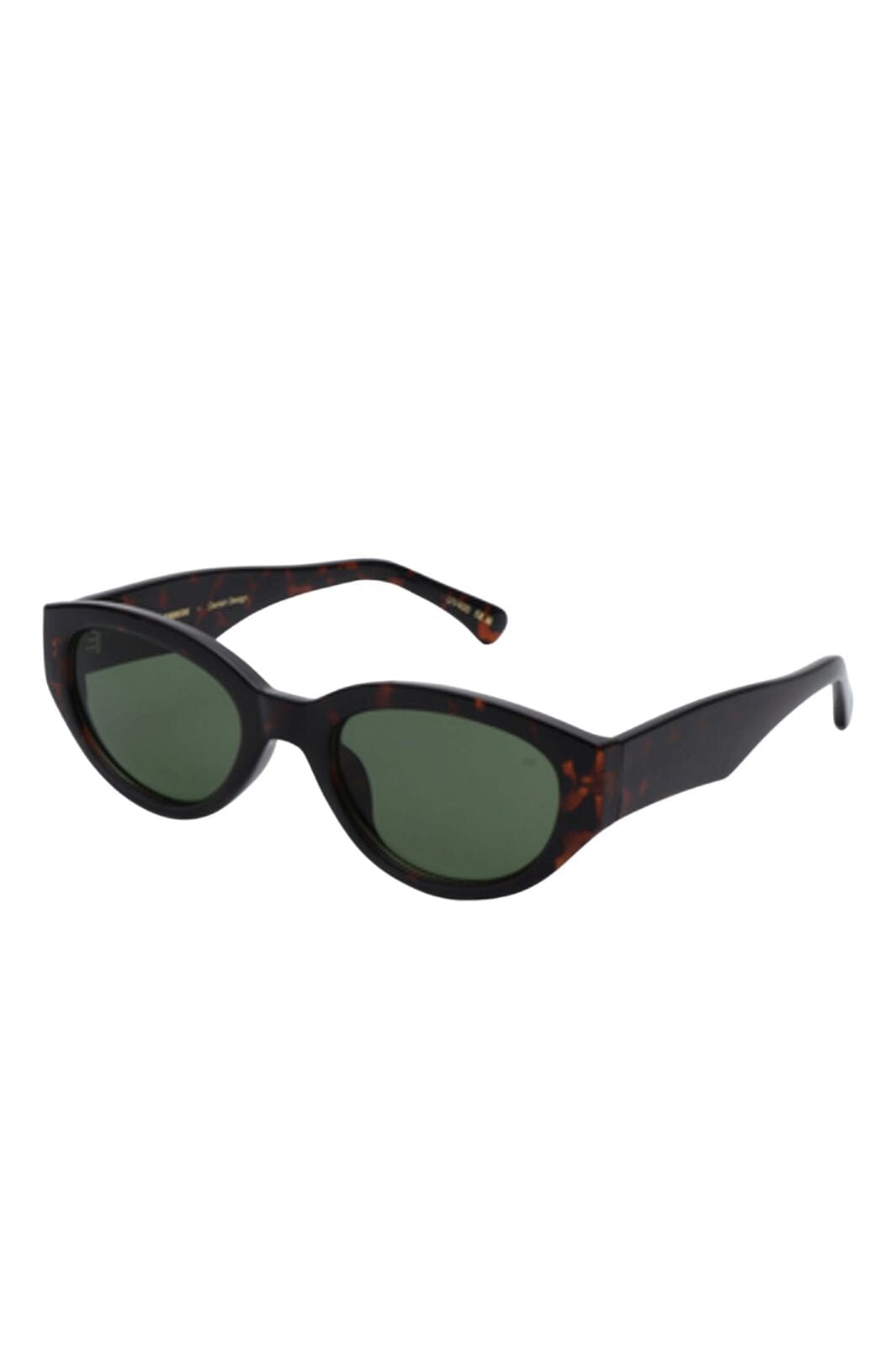Sonnenbrillen von A. Kjærbede mit grünen Gläsern und braunem Demi Tortoise-Rahmen in Katzenaugenform. Der Rahmen besteht aus Tritan Renew mit formbaren Bügeln und Polycarbonatgläsern.
