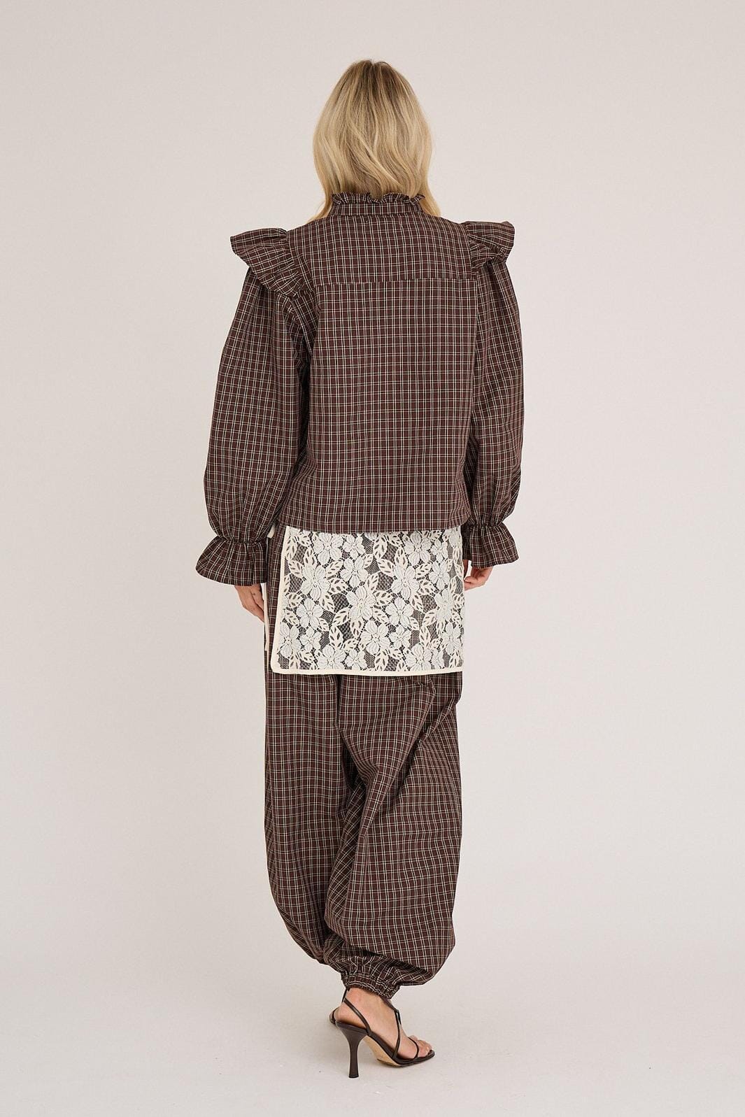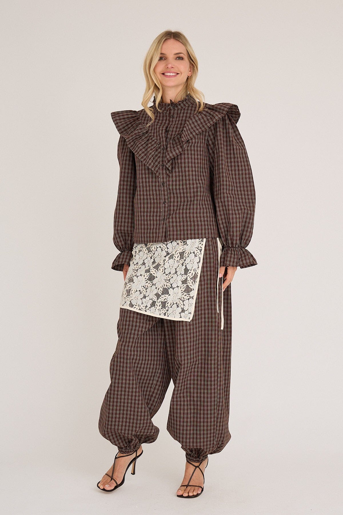 Off-white Wickelrock von A-View mit Spitzendetails und seitlichem Bindeband. Der Rock hat eine Oberschenkellänge und ein geblümtes Spitzenmuster, das mit karierten Elementen kombiniert wird.