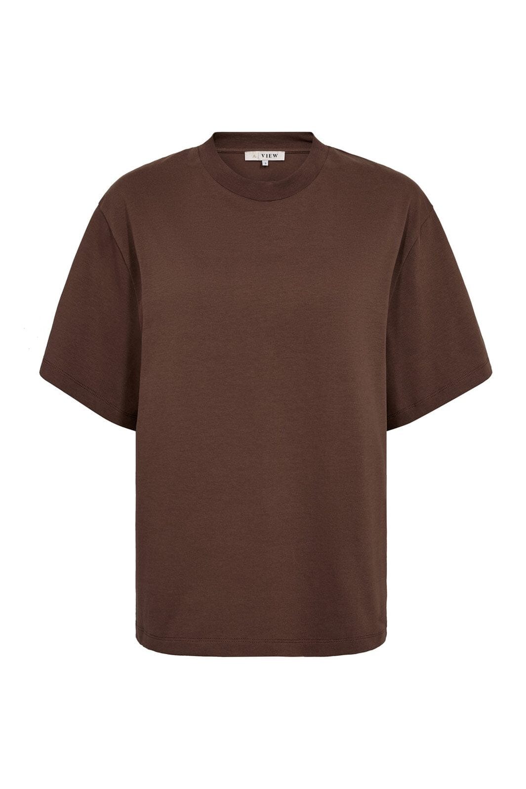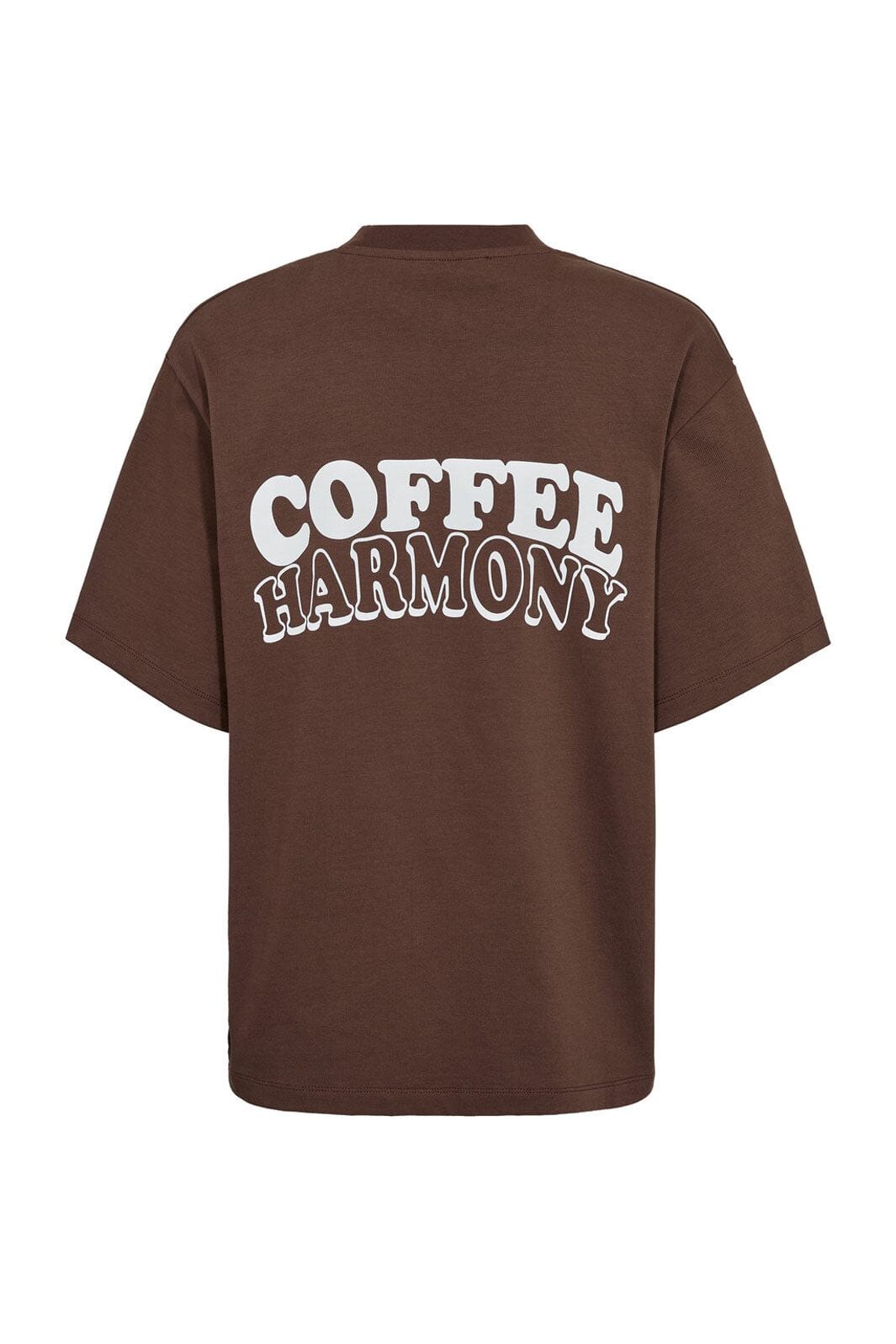 Braunes T-Shirt von A-View mit einem großen COFFEE HARMONY-Print auf dem Rücken. Das T-Shirt hat eine lockere Passform und ist aus Bio-Baumwolle mit Rundhalsausschnitt gefertigt.