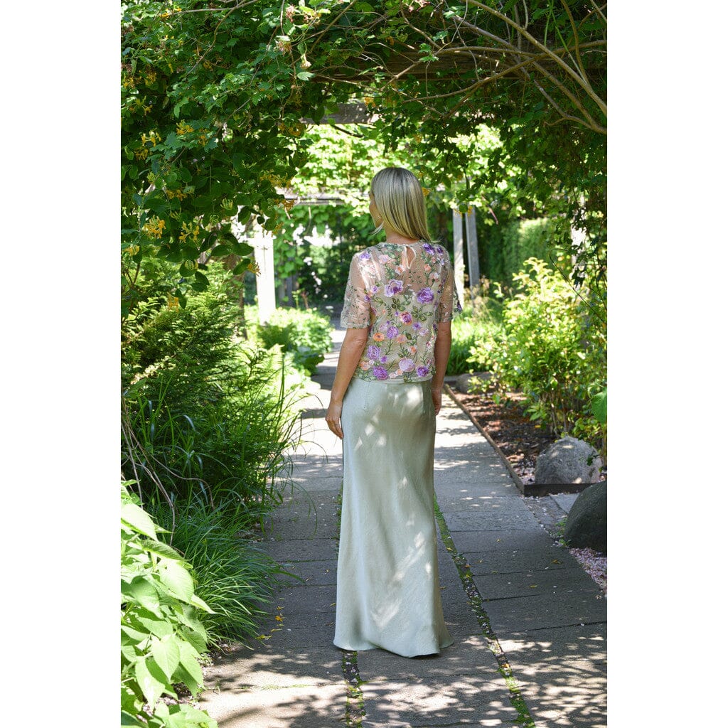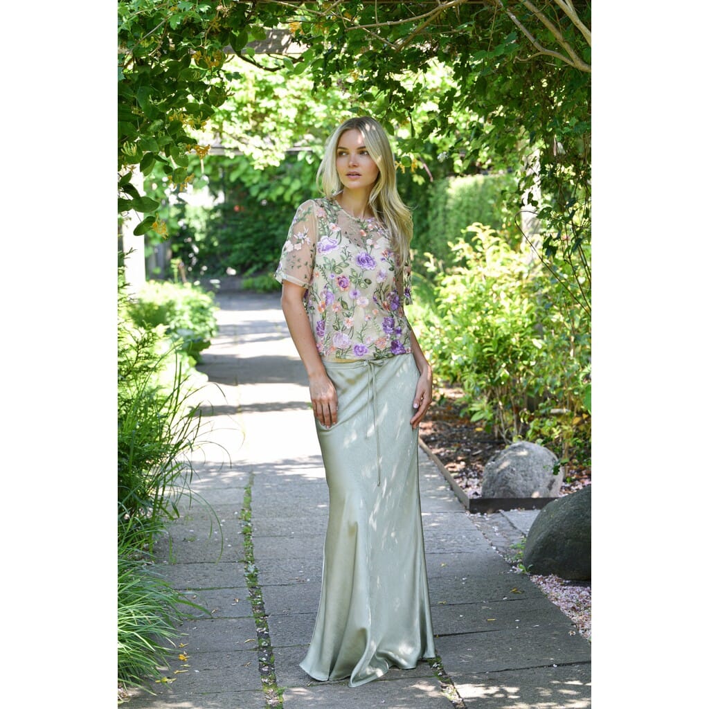 Bluse von A-View aus transparentem Mesh in grünen und lila Nuancen. Die Bluse hat gestickte Blumen und eignet sich sowohl für formelle als auch für festliche Anlässe.