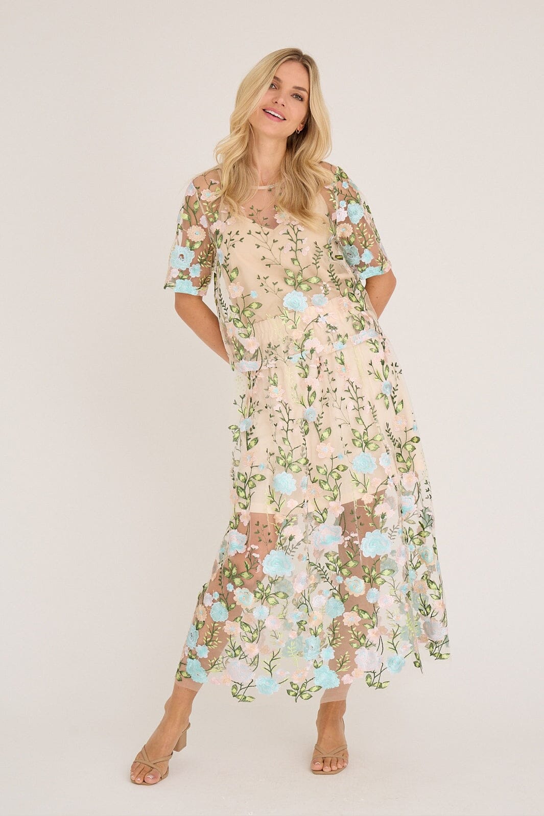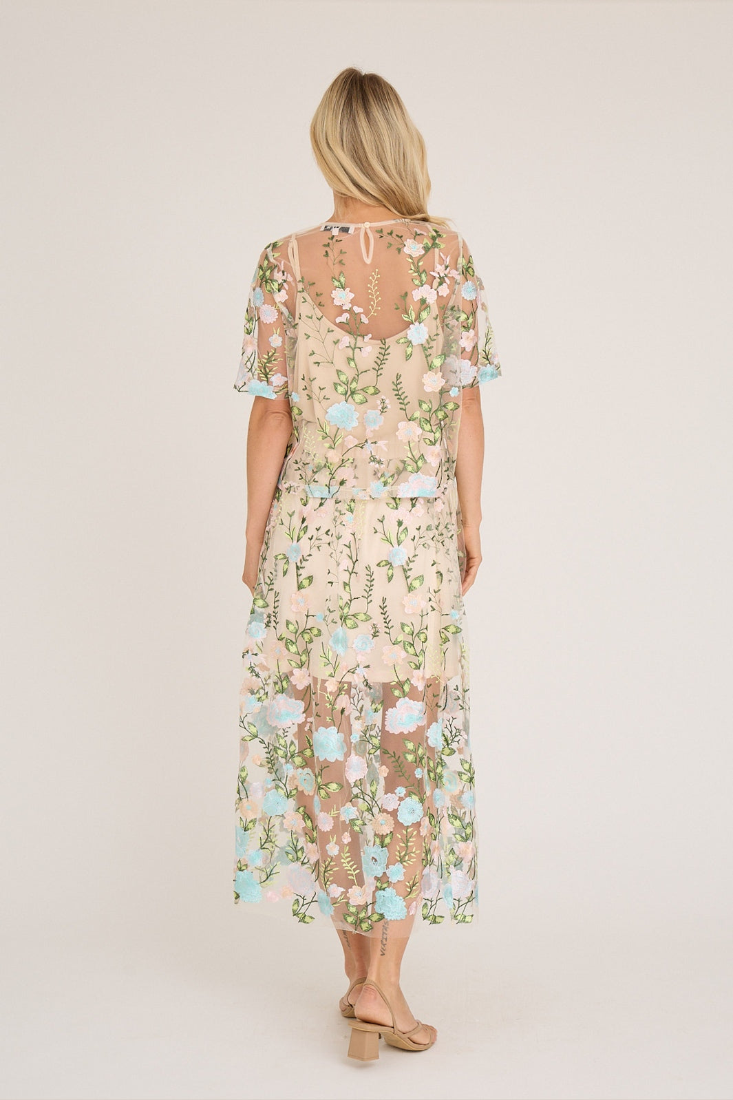 Bluse von A-View mit transparentem Mesh und bestickten Blumen in Rosa- und Blautönen. Das mehrfarbige Muster verleiht der Bluse einen lebendigen Ausdruck.