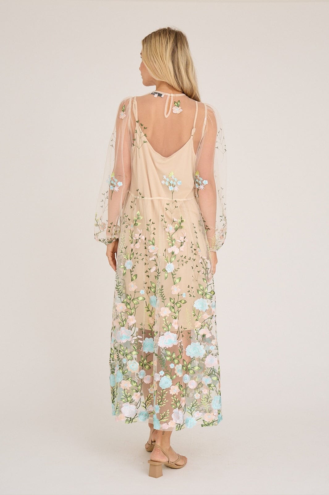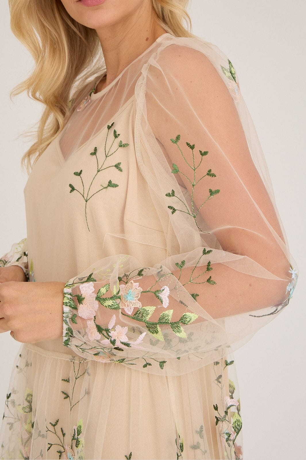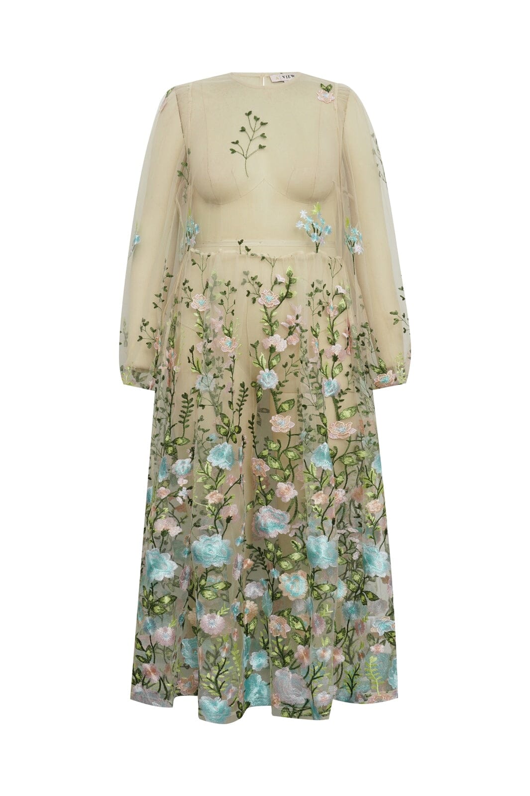 Kleid von A-View aus transparentem Mesh mit gestickten Blumen in rosa und blauen Nuancen. Das Kleid hat eine lockere Passform und ist knöchellang.