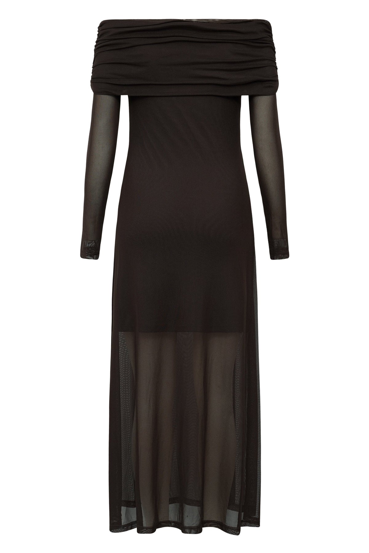 Schwarzes knöchellanges Kleid von A-View mit transparenten Ärmeln und Off-Shoulder-Design. Der transparente Unterstoff sorgt für einen Lagen-Look mit tollen Details.