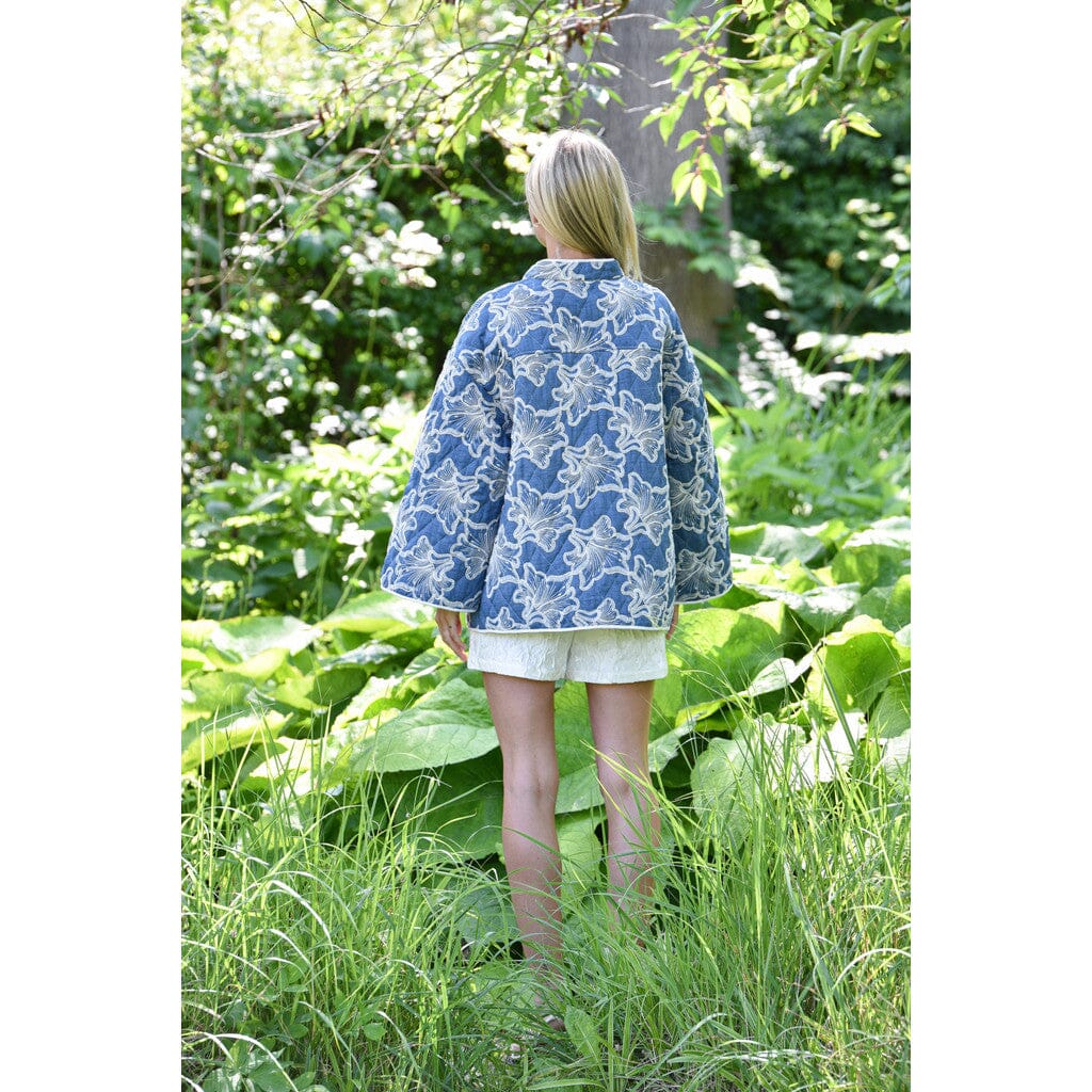 Blaue Jacke von A-View mit cremeweißer Blumenstickerei. Die Jacke hat dekorative Nähte und Bindedetails, die ihr einen handgearbeiteten Ausdruck verleihen.