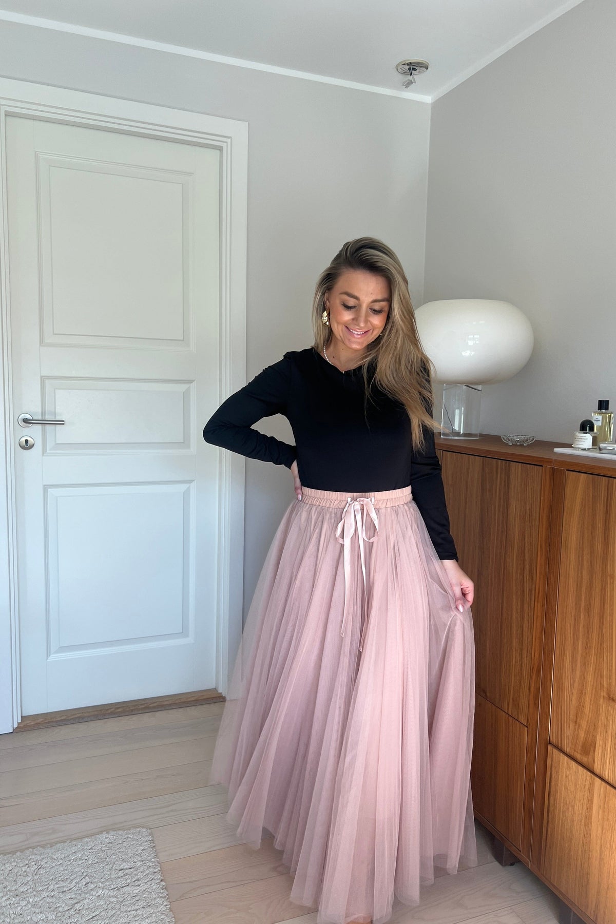 Knöchellanger Rock in einem hellen Rosaton. Er hat eine luftige Struktur mit Rüschen und einem Bindeband in der Taille, das die Weite anpasst.