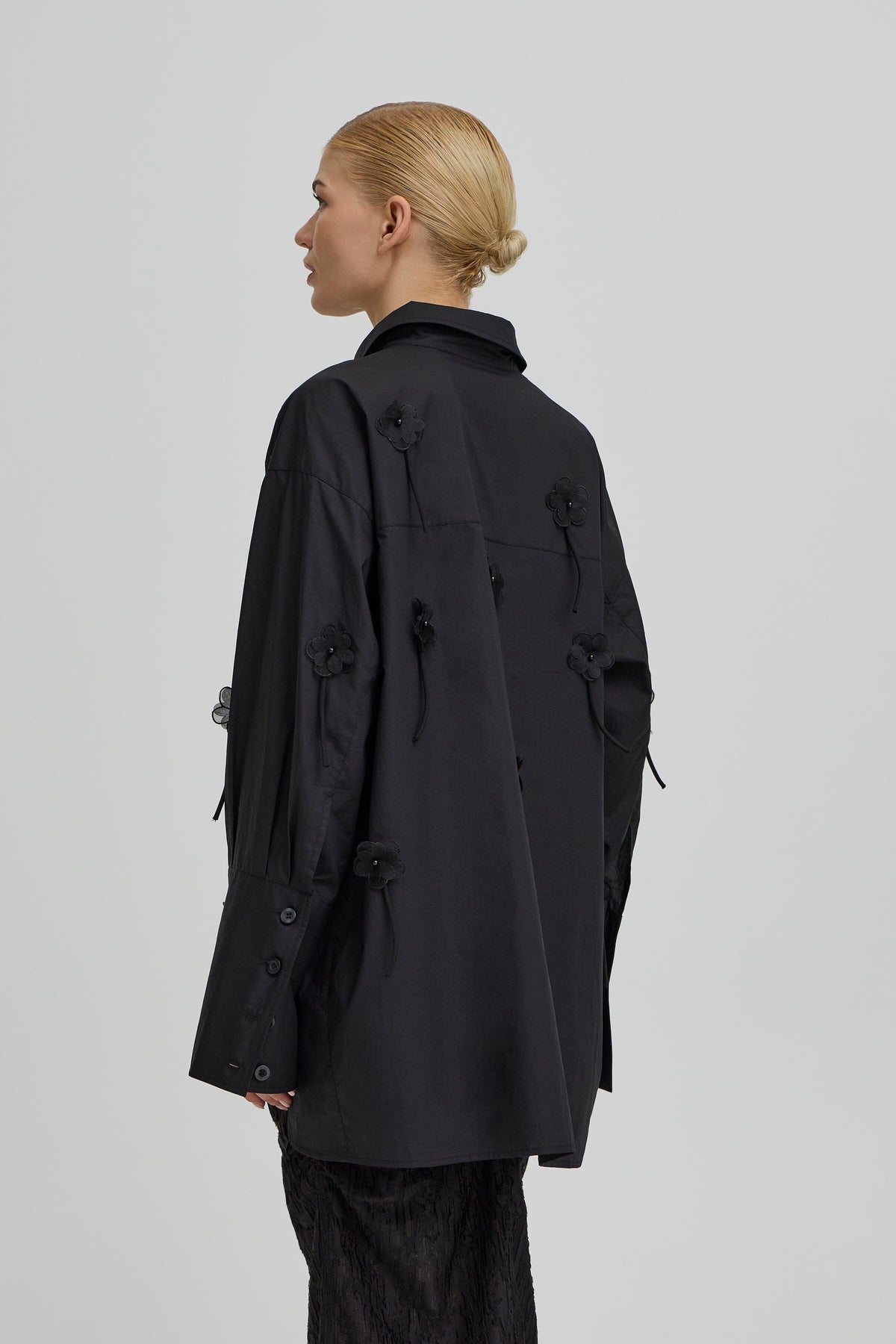 Schwarzes Hemd von Ball aus 100 % Baumwolle. Das Hemd hat dekorative Nähte und Bindeelemente, die ihm einen künstlerischen Ausdruck verleihen.