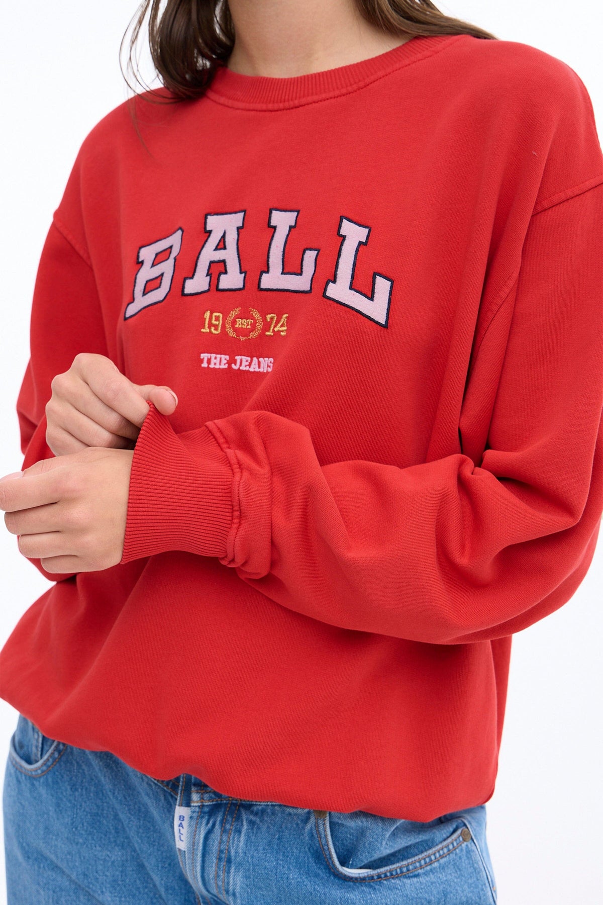 Roter Sweatshirt von Ball mit lockerer Passform. Das Sweatshirt hat ein gesticktes BALL-Logo auf der Brust zusammen mit dem Jahr 1974 und dem Text THE JEANS.