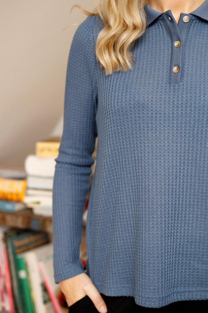 Langarm-Polo von Black Colour in Jeansblau. Das T-Shirt hat eine strukturierte Oberfläche und einen Polokragen mit Knopfleiste. Die reguläre Passform macht es angenehm zu tragen.