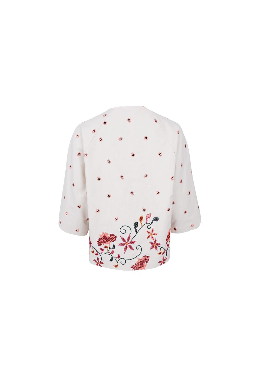 - Blumenstickerei am unteren Rand der Jacke