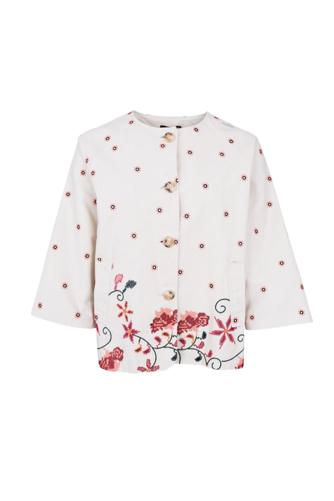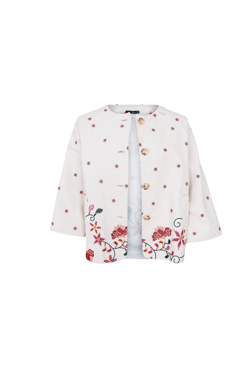 Jacke von Black Colour in einem weiß-cremefarbenen Ton mit Blumenstickerei. Die Jacke hat große Knöpfe entlang der Vorderseite und kleine, verstreute Muster über die gesamte Oberfläche.