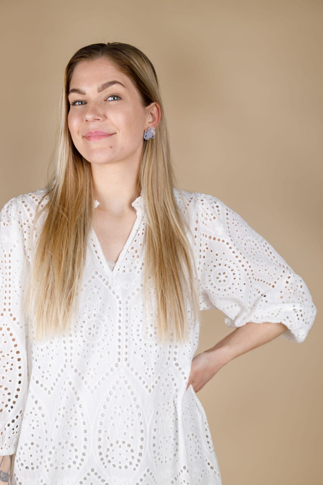 Ohrringe von Black Colour in Hellblau mit kleinen Perlen in einem blütenähnlichen Design. Die Ohrringe haben ein komplexes Muster mit Schlaufen und Perlengruppen.