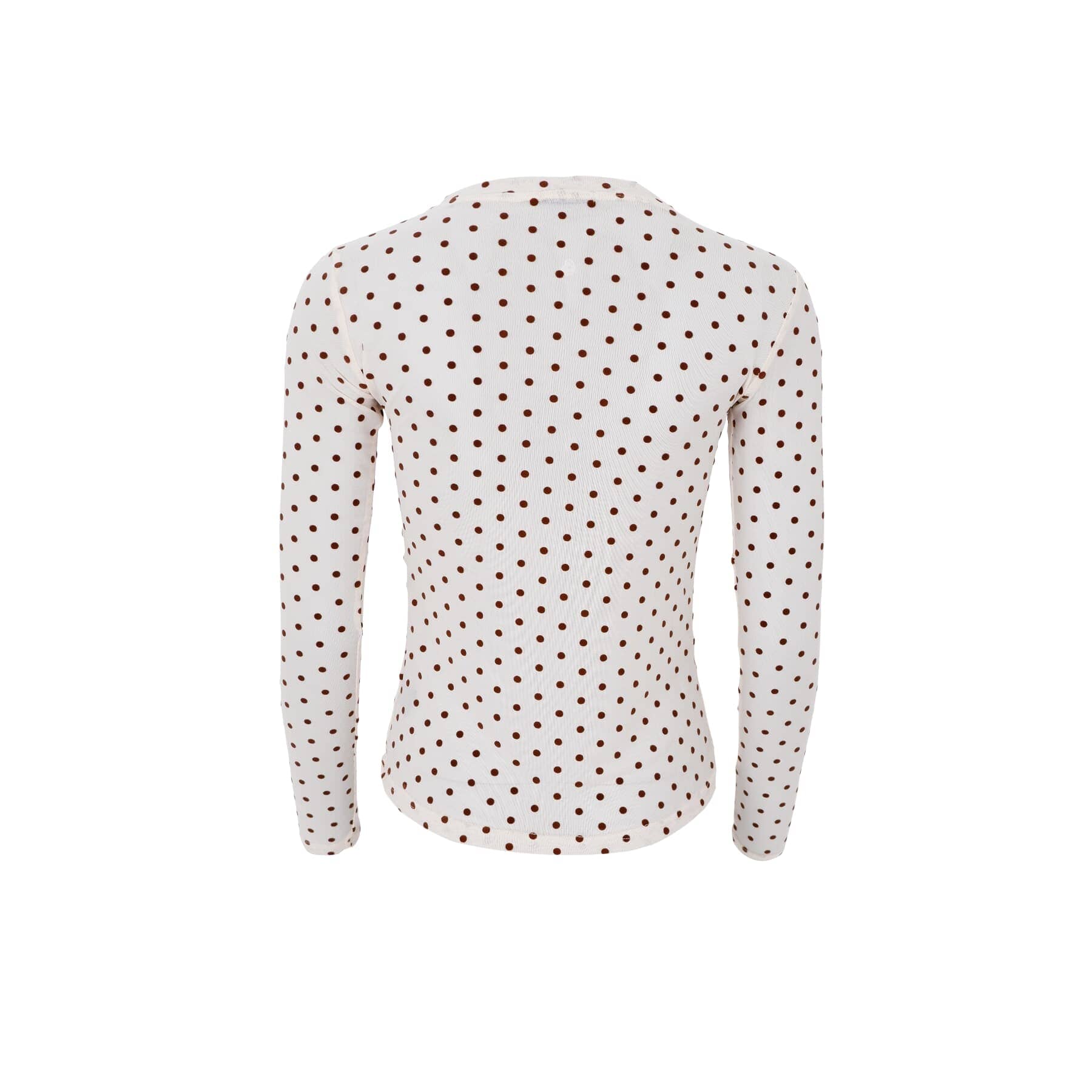 Mesh-Bluse von Black Colour in hellem Creme mit schwarzen Punkten. Die Bluse hat einen hohen Kragen, lange Ärmel und eine schmale Passform.