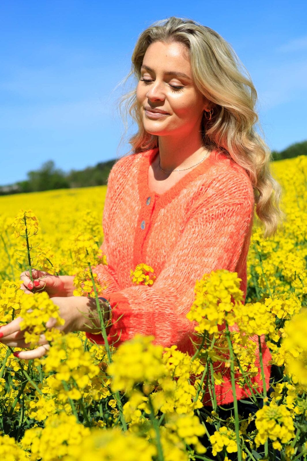 Orangene Strickjacke von Black Colour mit lockerer Passform. Sie hat einen runden Halsausschnitt und eine Knopfleiste vorne. Das Strickmaterial hat eine weiche und angenehme Qualität.