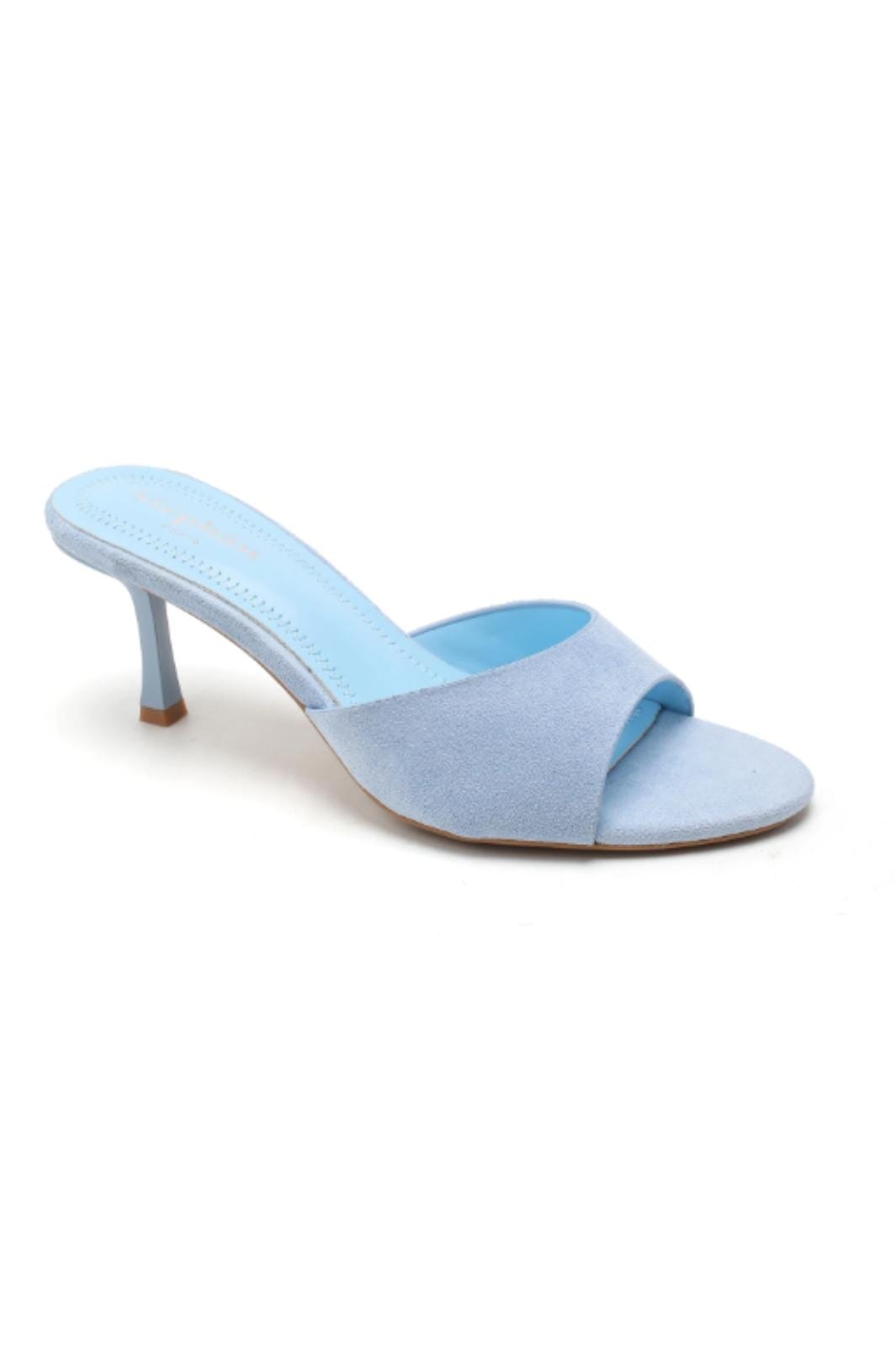 Stilettos von Bloom in einem hellen himmelblauen Farbton. Die Schuhe bestehen aus synthetischem Material und haben ein offenes Design.