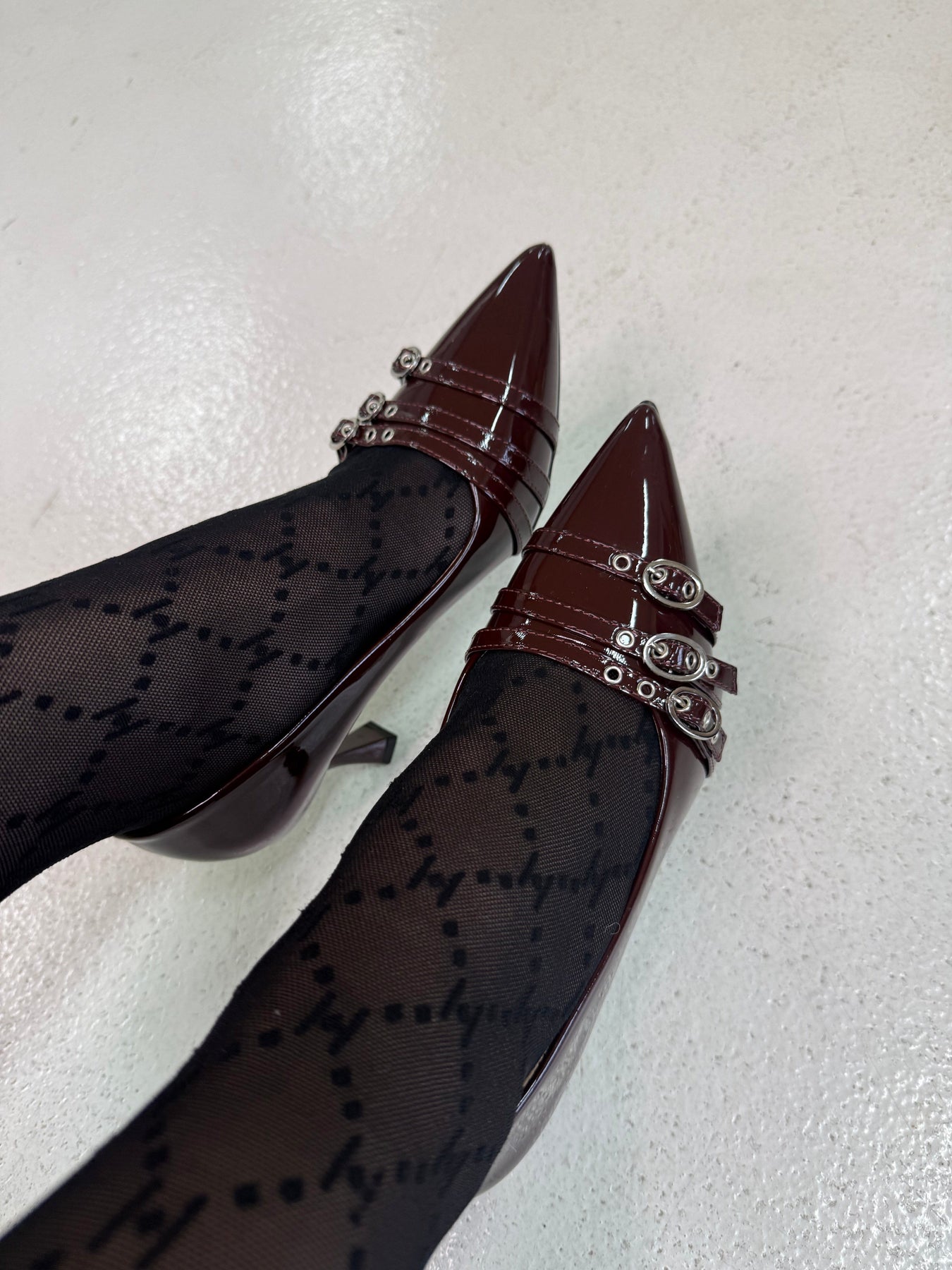 Stilettschuhe von Bloom in einem dunklen Bordeauxfarbton. Der Schuh hat einen Stilettoabsatz und eine eckige Zehenpartie.