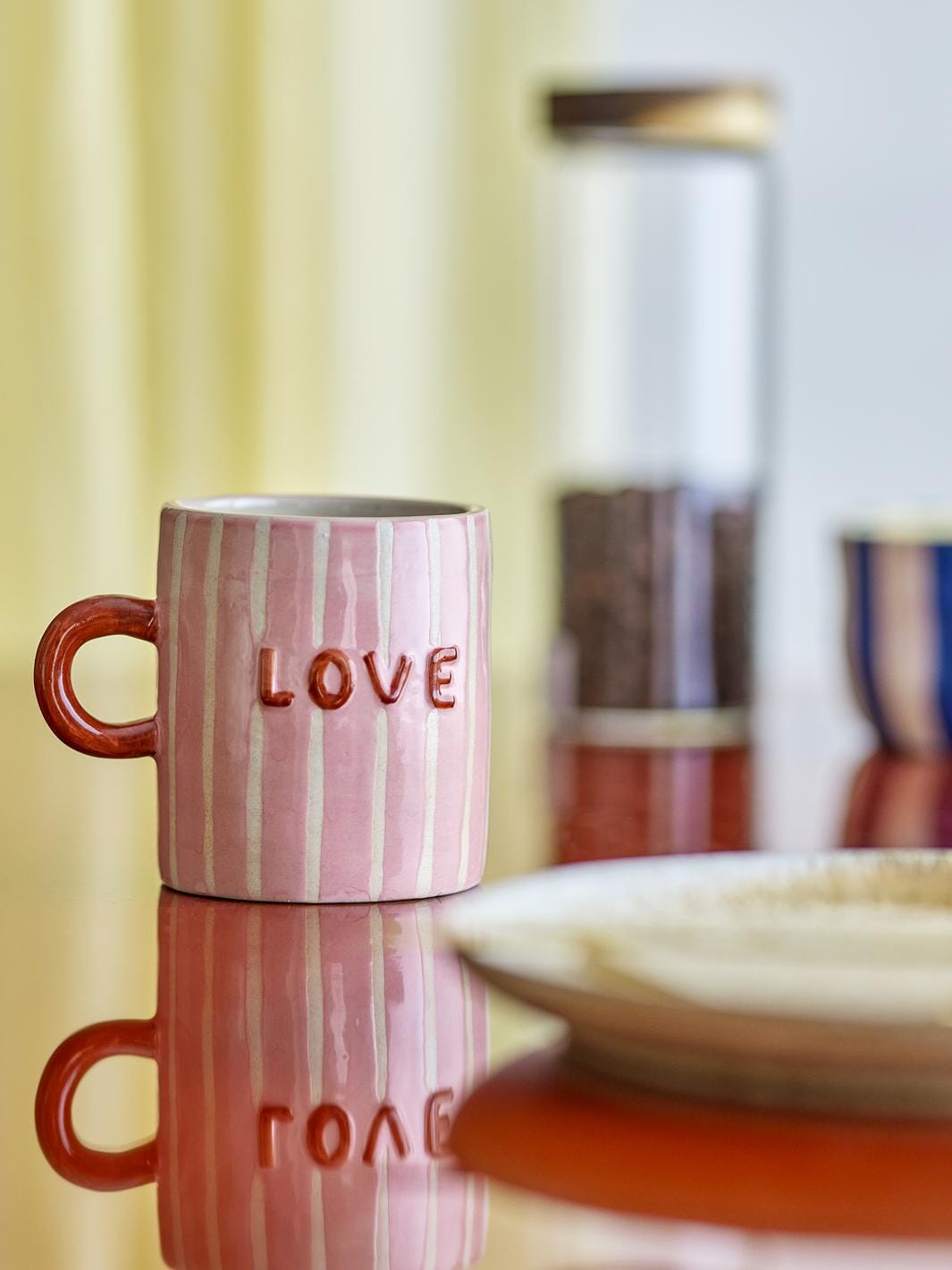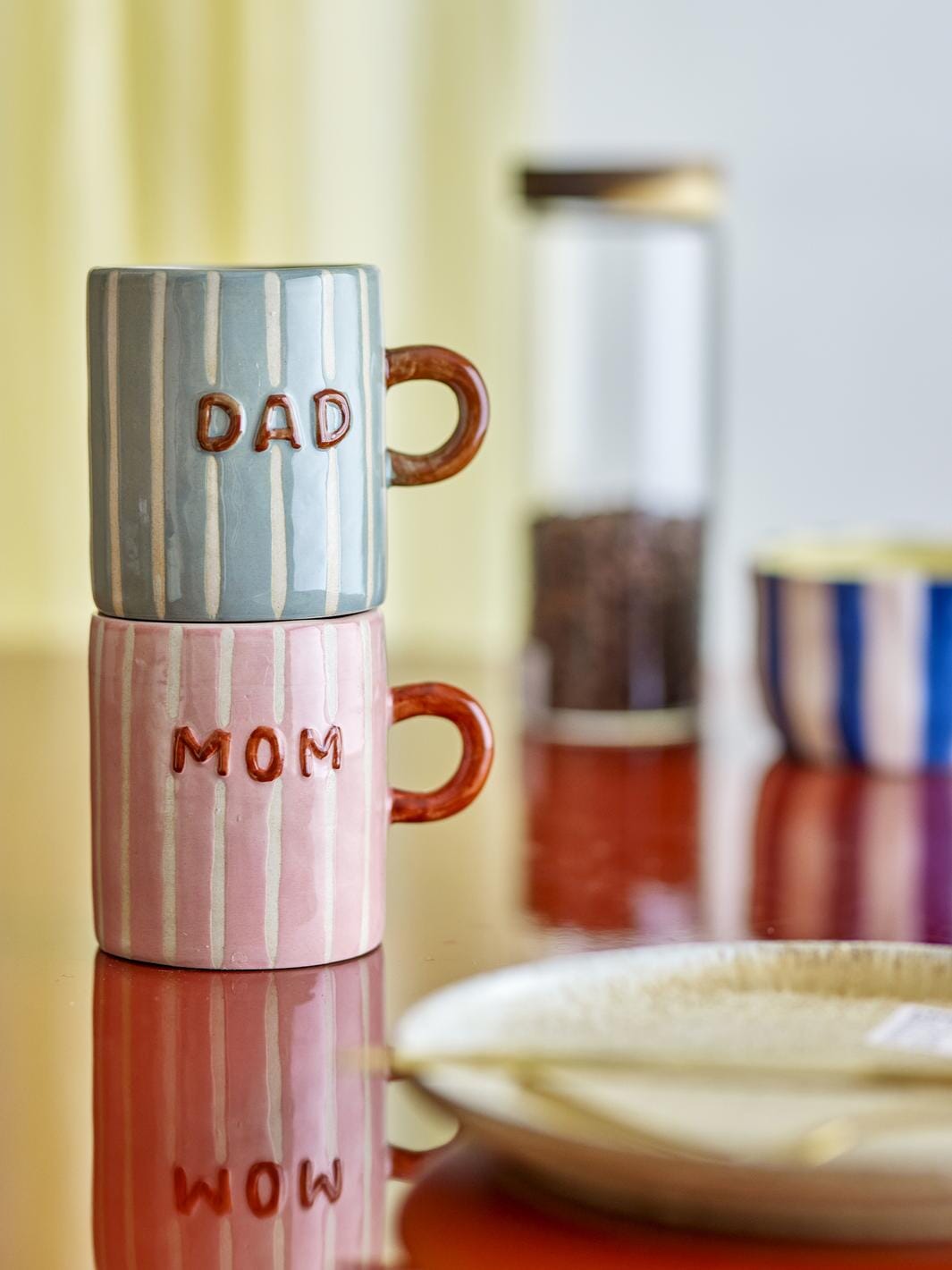 Rosa Becher von Bloomingville aus Steingut mit handgemalten vertikalen cremefarbenen Streifen. Das Wort MOM ist auf beiden Seiten aufgedruckt, und der Henkel ist dunkel terrakottafarben.
