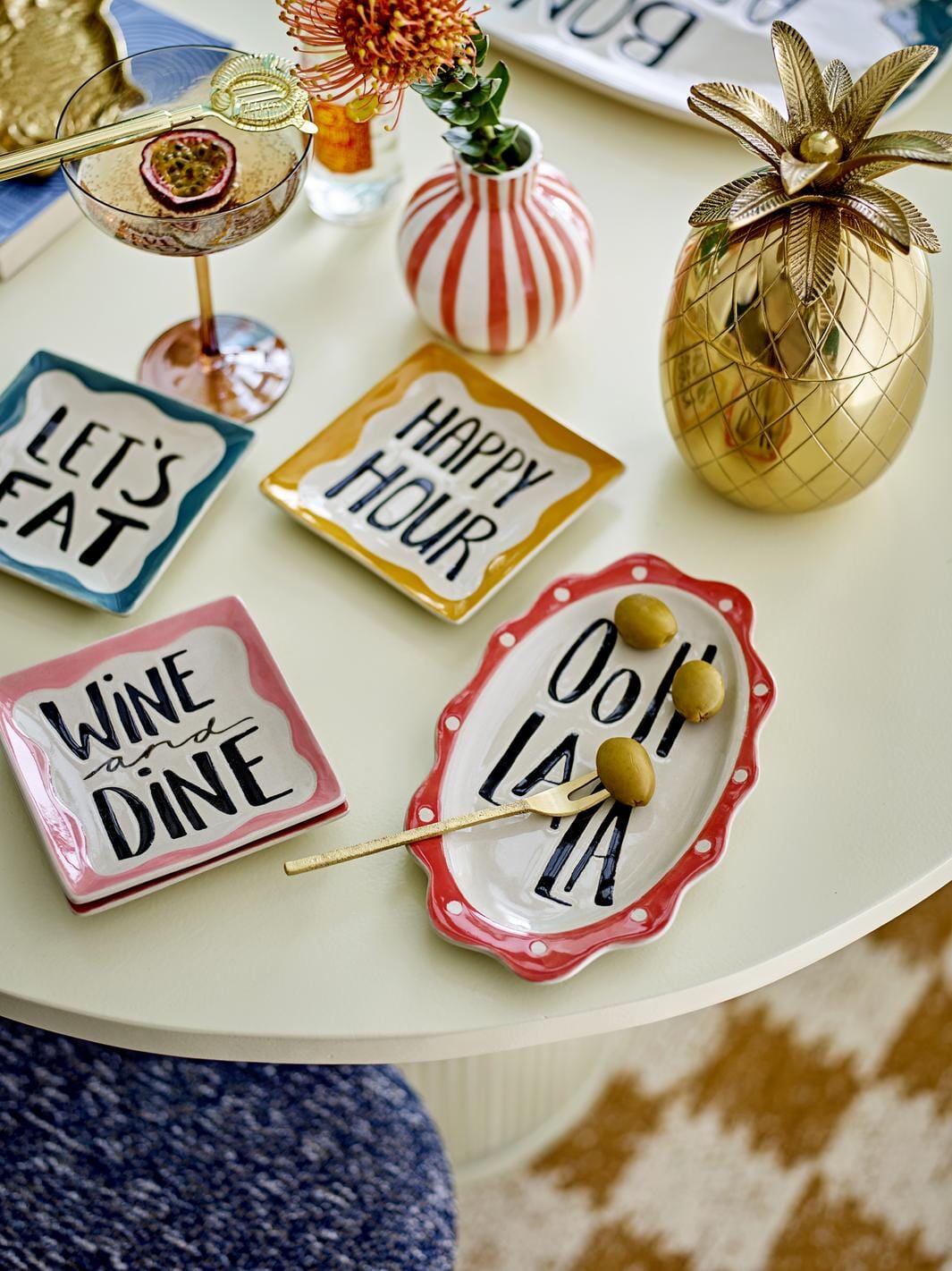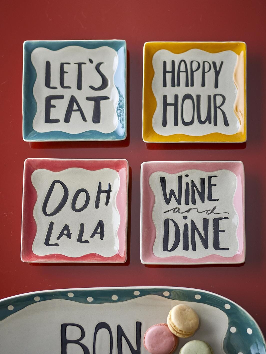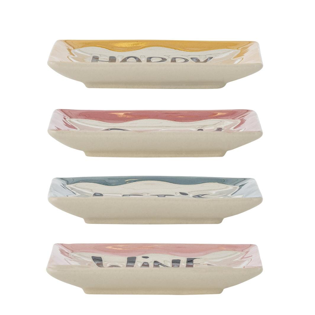 Rechteckige Teller von Bloomingville aus Steingut mit handbemalten Oberflächen. Jeder Teller hat ein cremefarbenes Feld in der Mitte und farbige Ränder in Pink, Gelb, Blau oder Rot.