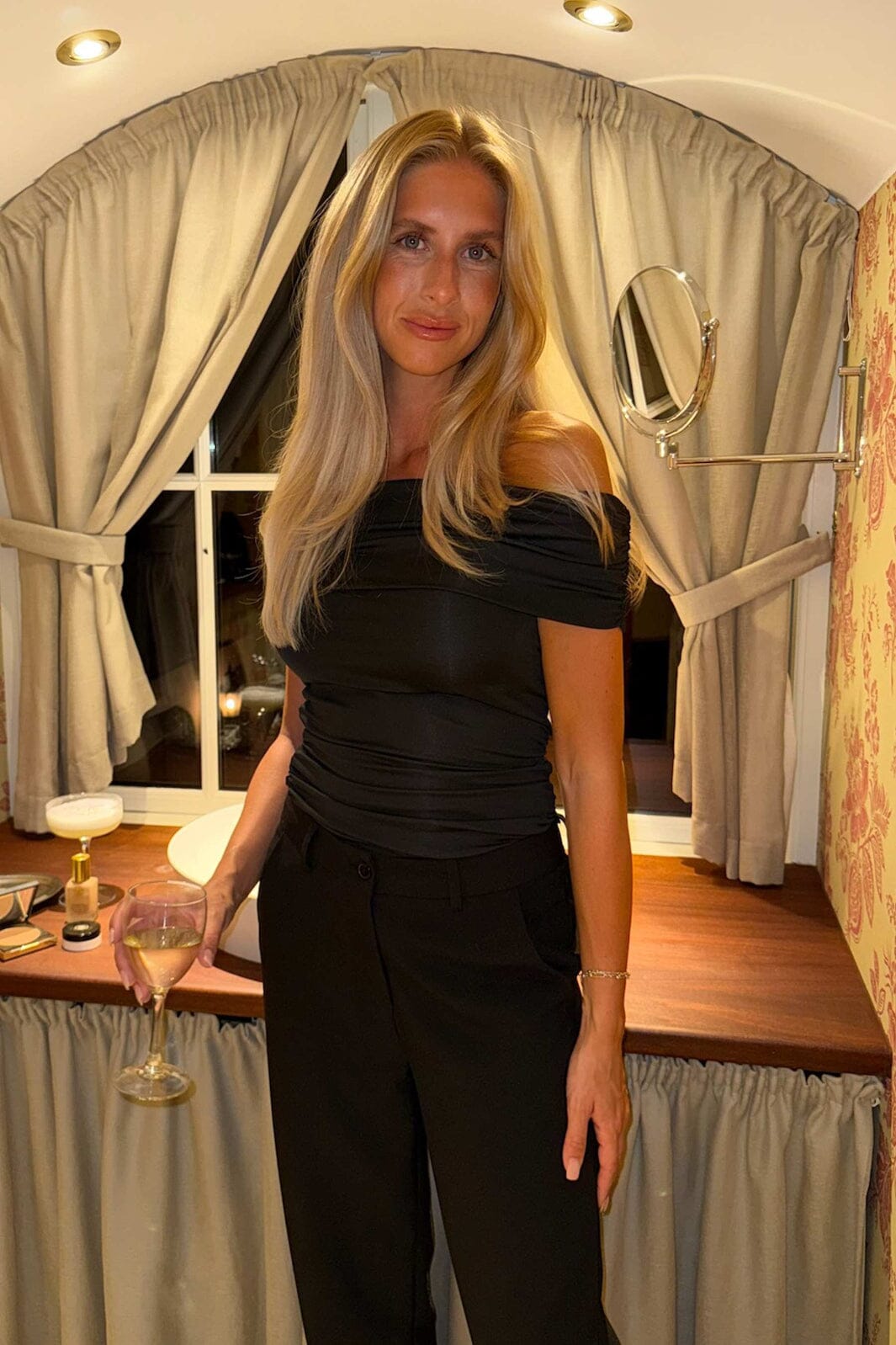 Schwarzes Top von BYIC mit Off-Shoulder-Design. Das Top hat geraffte Details entlang der Seiten und an den Schultern. Das eng anliegende Modell ist aus dehnbarem Stoff gefertigt.