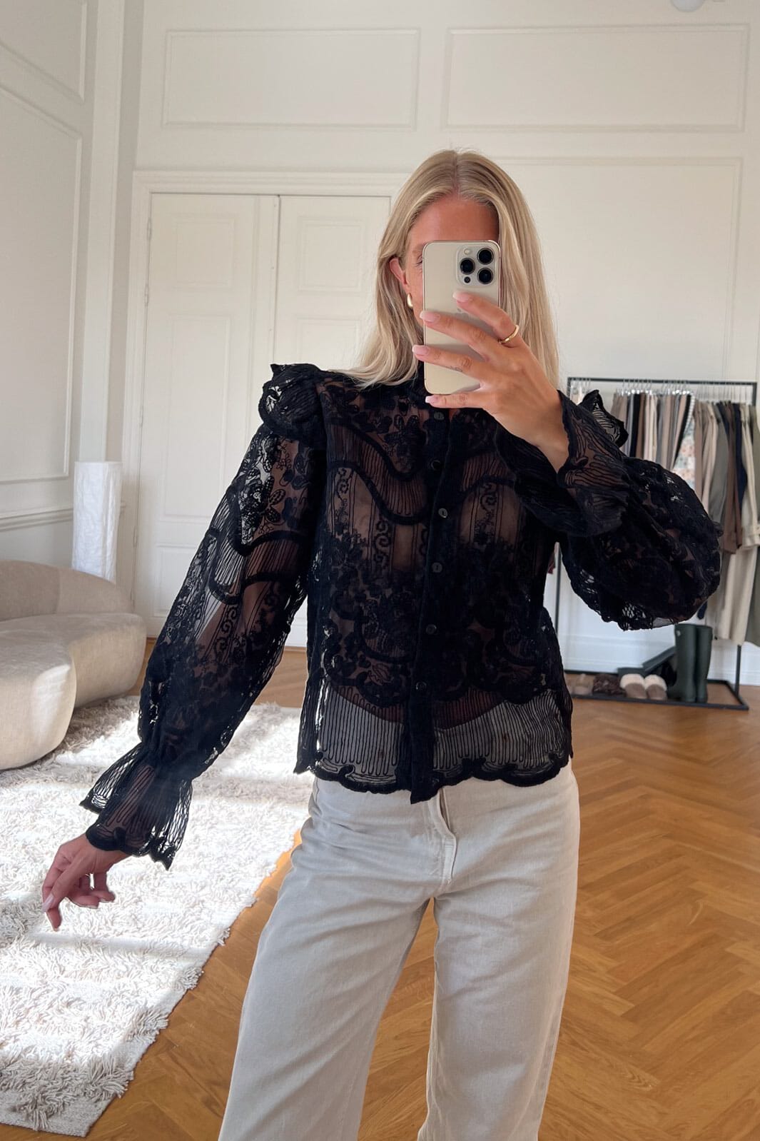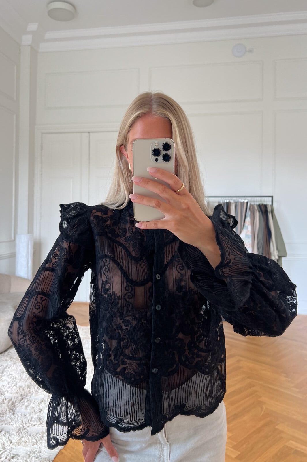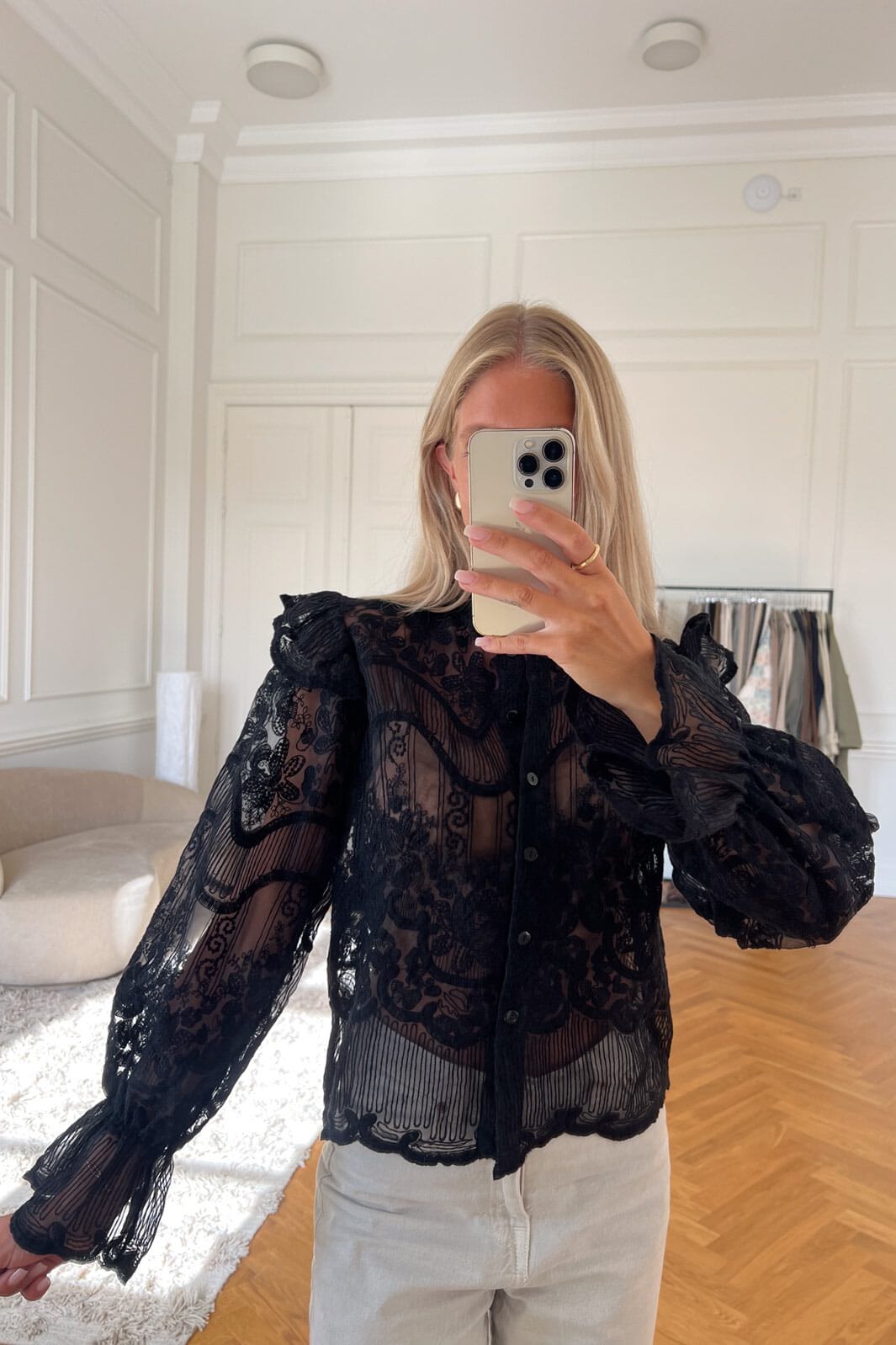 Schwarze Bluse aus transparentem Spitzenstoff mit hohem Kragen und Knopfverschluss. Die Bluse hat puffige Ärmel mit Rüschen-Details und eine lockere Passform, die sie sowohl für den Alltag als auch für Partys geeignet macht.