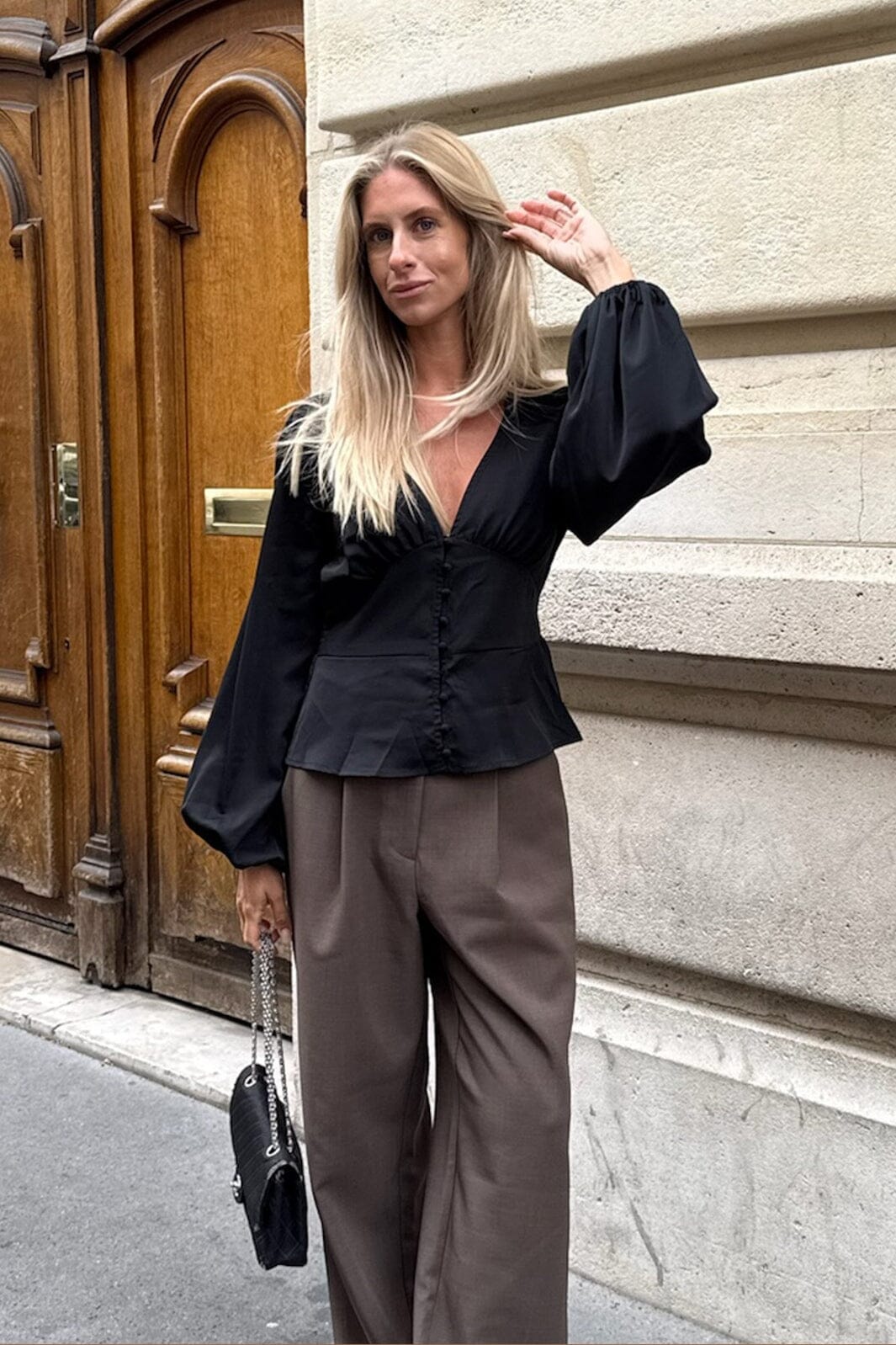 Schwarzes Hemd von BYIC mit V-Ausschnitt und Rüschen-Details. Das Hemd hat eine figurbetonte Silhouette und lange Ärmel mit elastischen Bündchen.