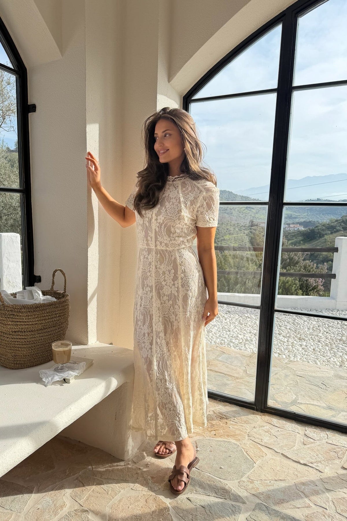 Langes Kleid von BYIC aus cremeweißer Spitze. Das Kleid eignet sich für Hochzeiten, formelle Anlässe und festliche Gelegenheiten.