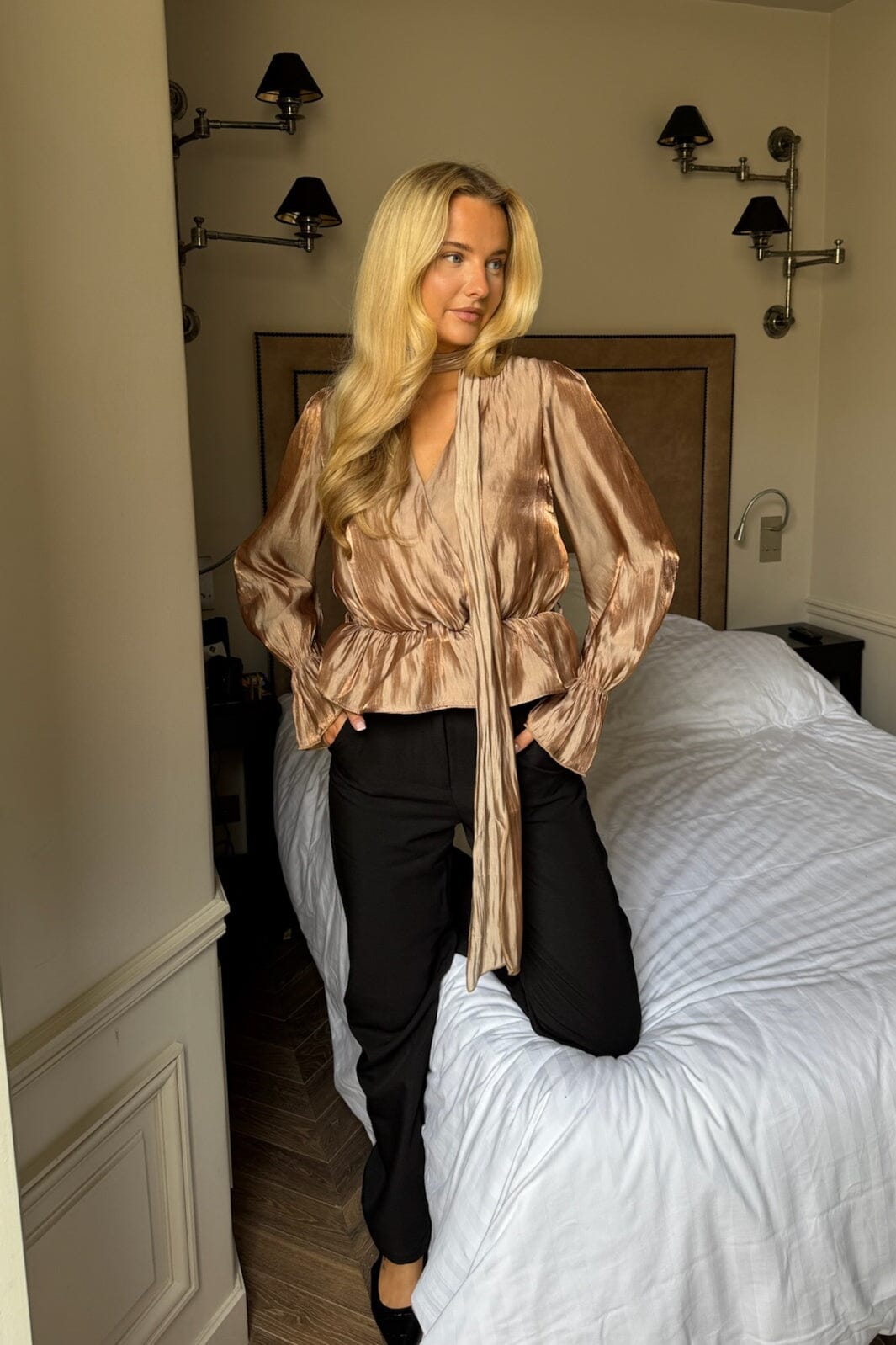 Die Bluse hat eine entspannte Passform mit einer betonten Taille, langen Ärmeln und einem tiefen V-Ausschnitt mit Wickel-Detail und feinen Rüschen.