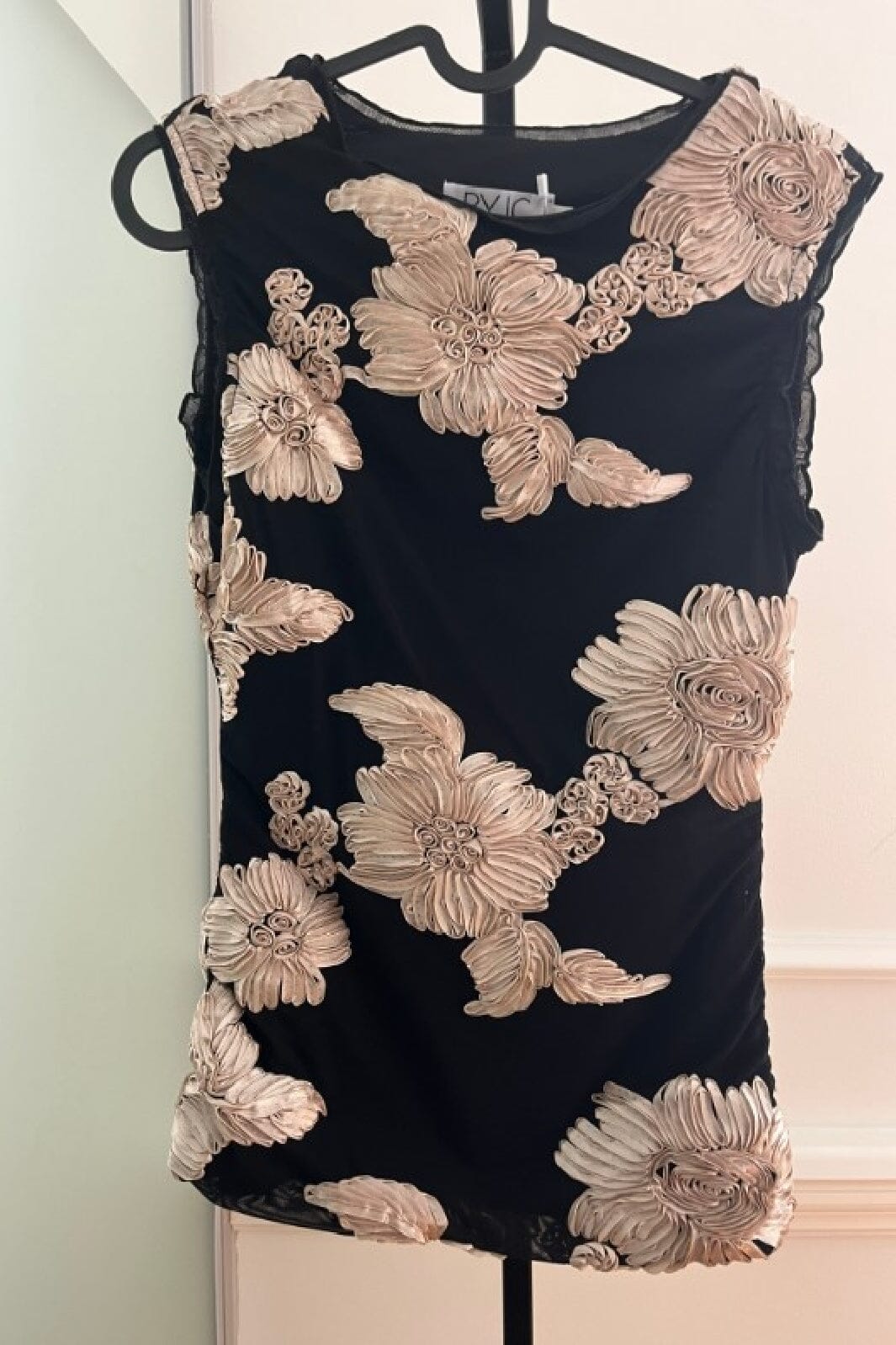 Schwarzes Mesh-Top von BYIC mit bestickten Blumen in Beige. Das Top hat 3D-Blumendetails und Rüschen an den Schultern, die ein einzigartiges Design mit Rüschendetails an den Seiten schaffen.